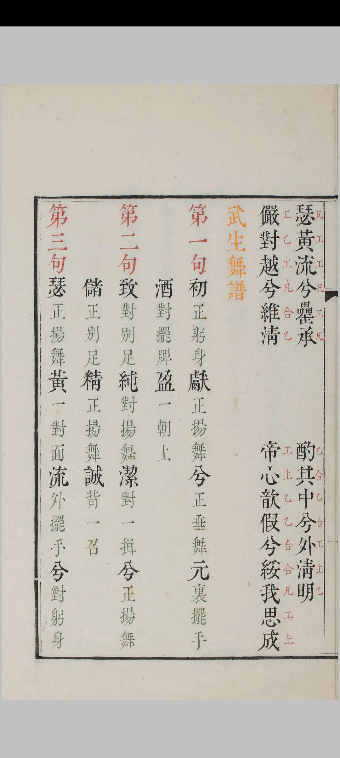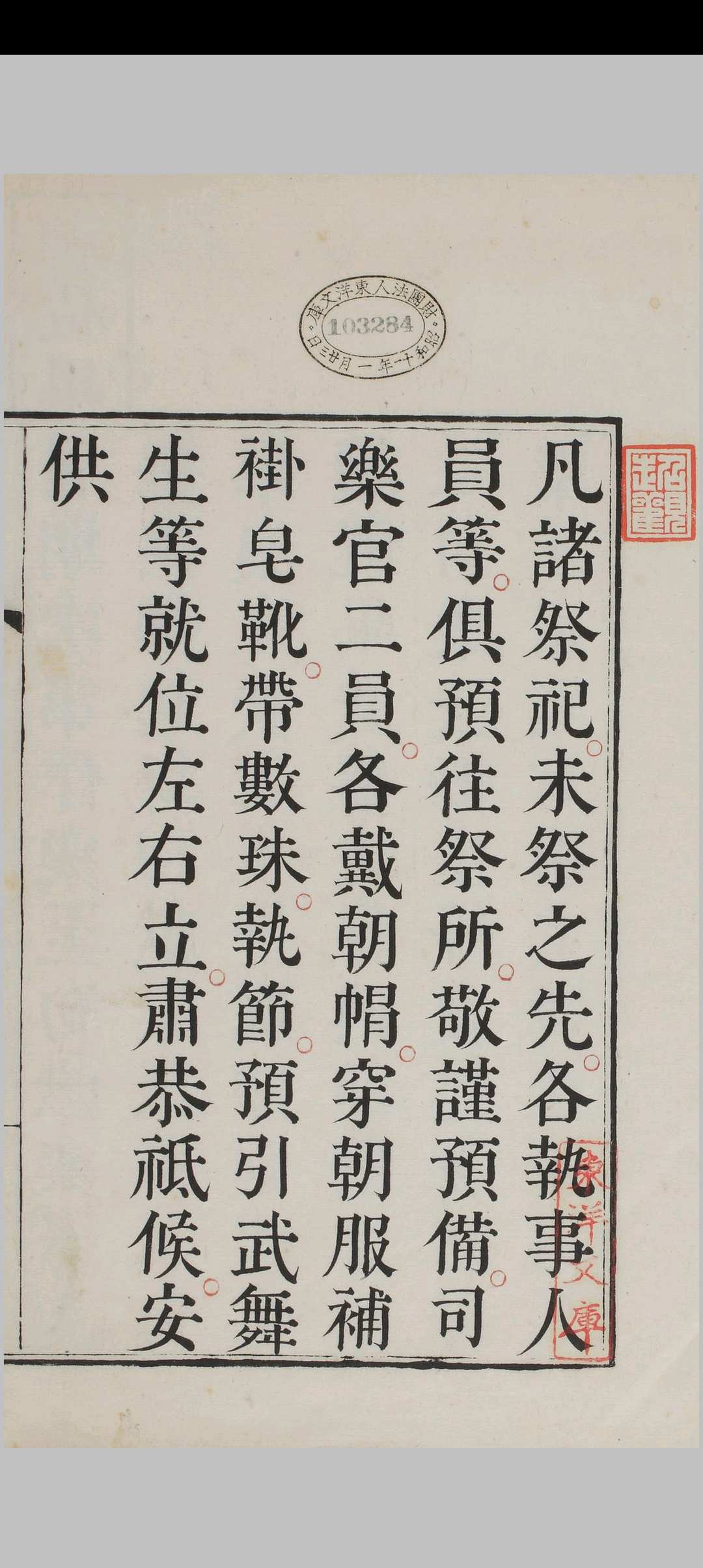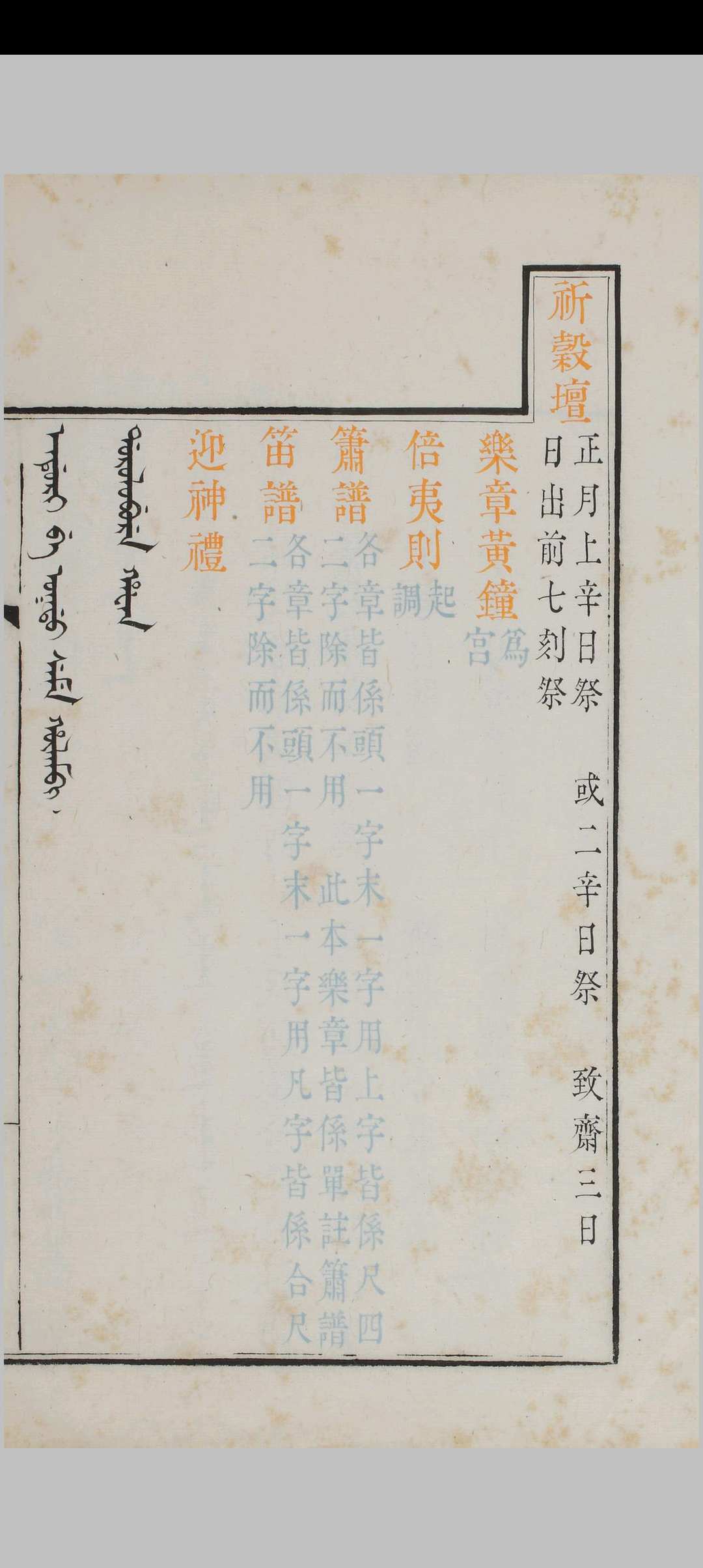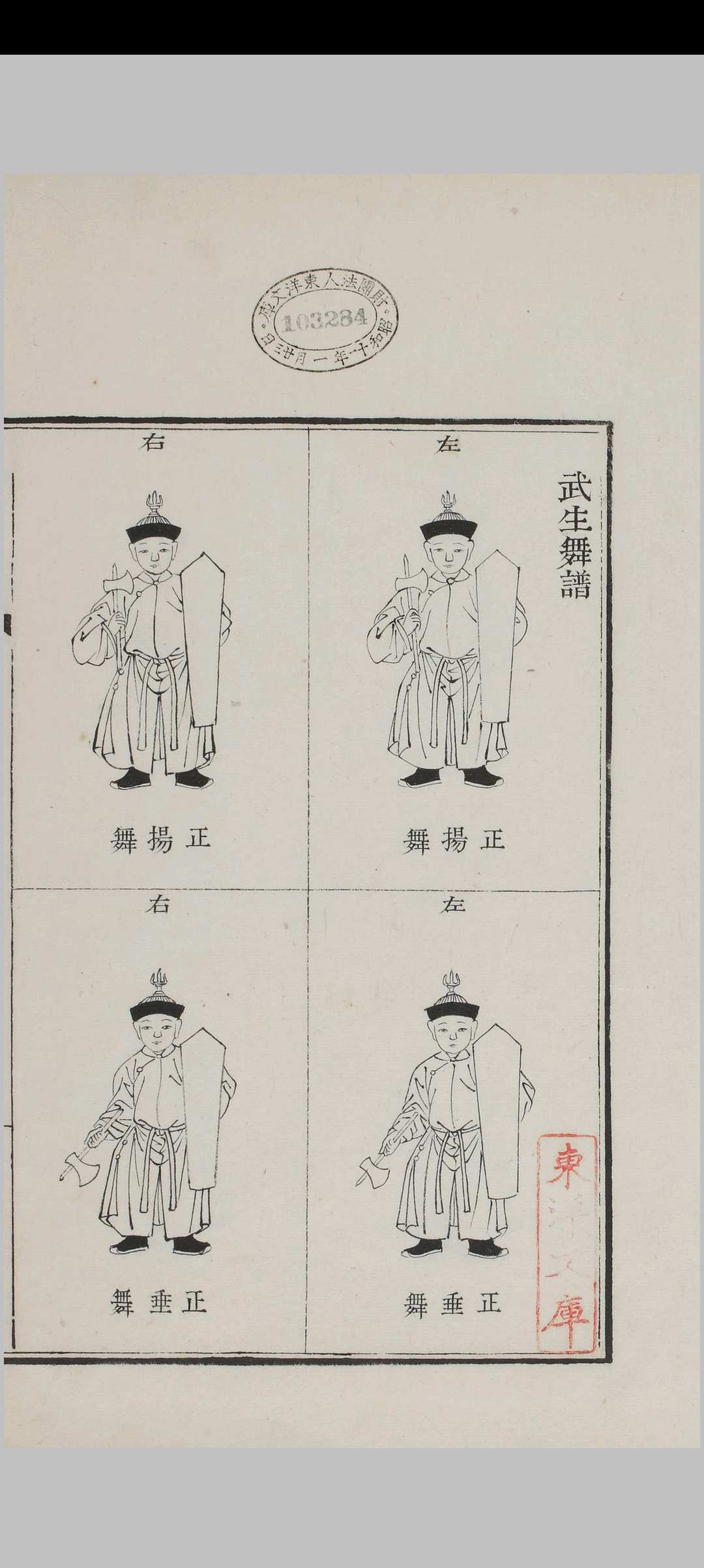 《坛庙祭祀节次》应该是清代乐部编撰,其内容主要是坛庙(天地、日月、五岳、四渎、社稷、先农、太庙、文庙等)祭祀相关礼仪。前三册为坛庙祭祀节次。册四为彩绘祭祀穿戴手执、册五为文生武生舞谱、册六为青衣童子舞谱。