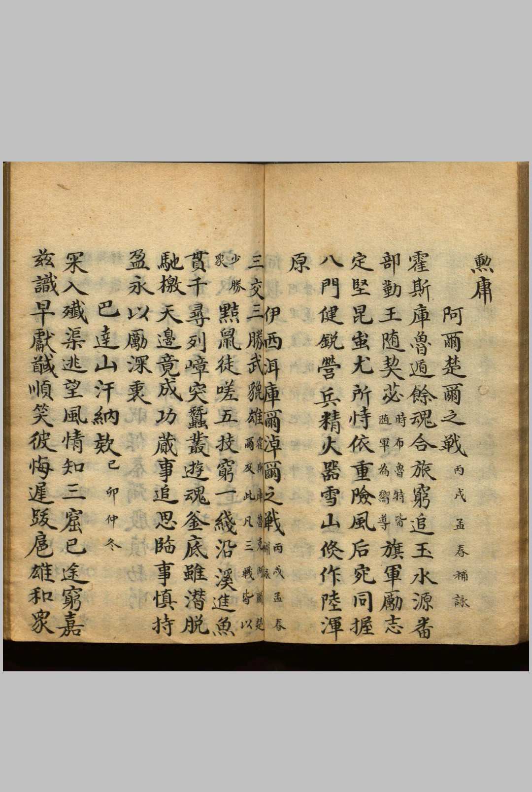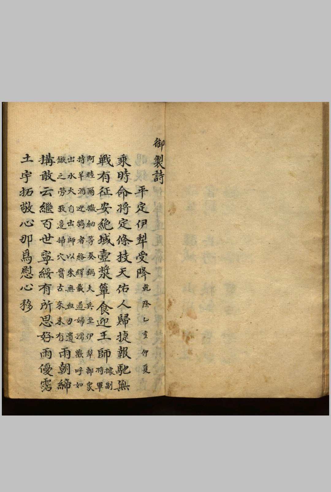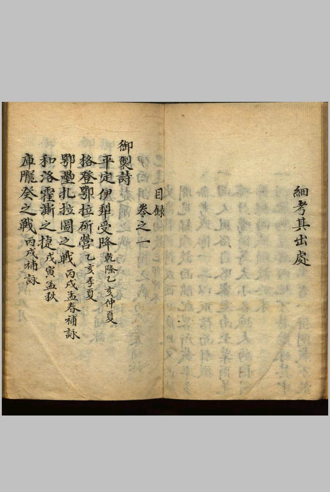 卷一收录自乾隆二十年( 1755) 至乾隆二十四年( 1759) 关于清王朝平定回疆始末以及主要战例的乾隆御制诗十九首;