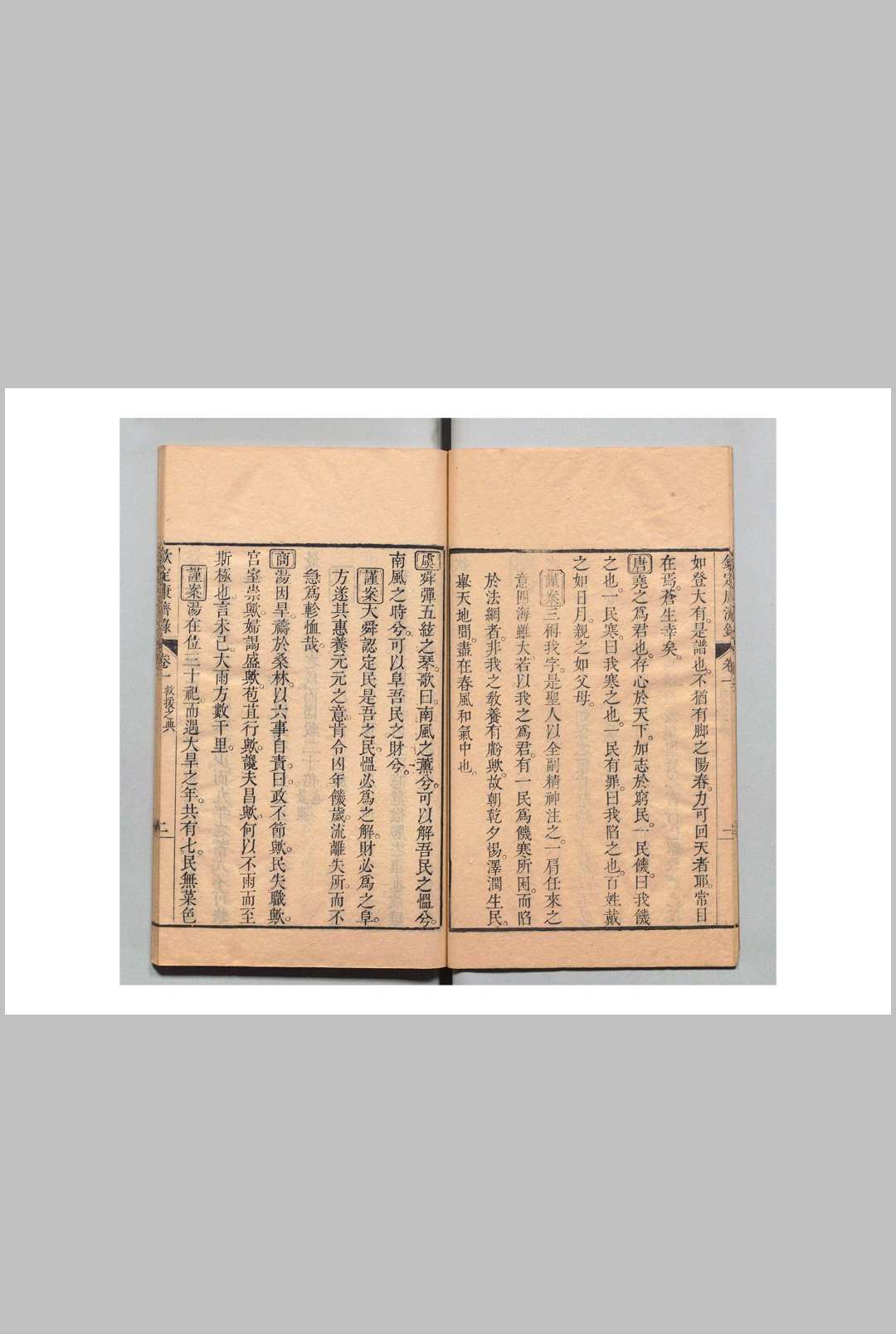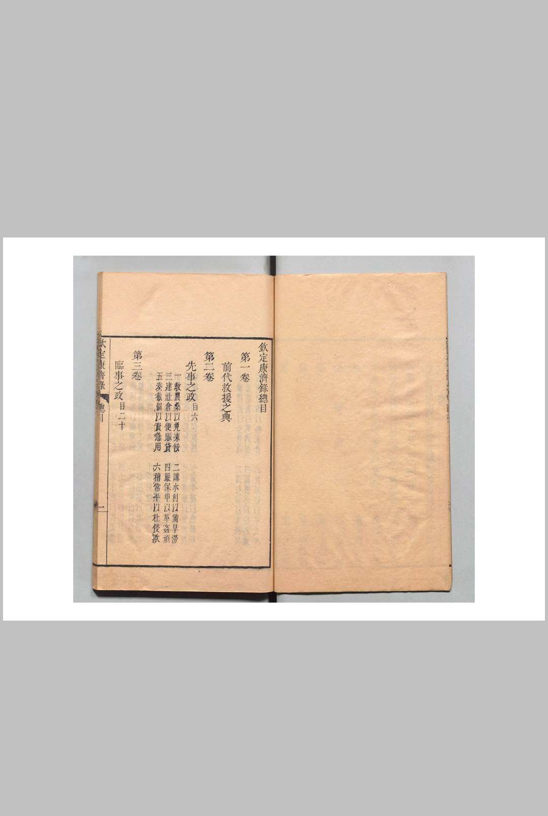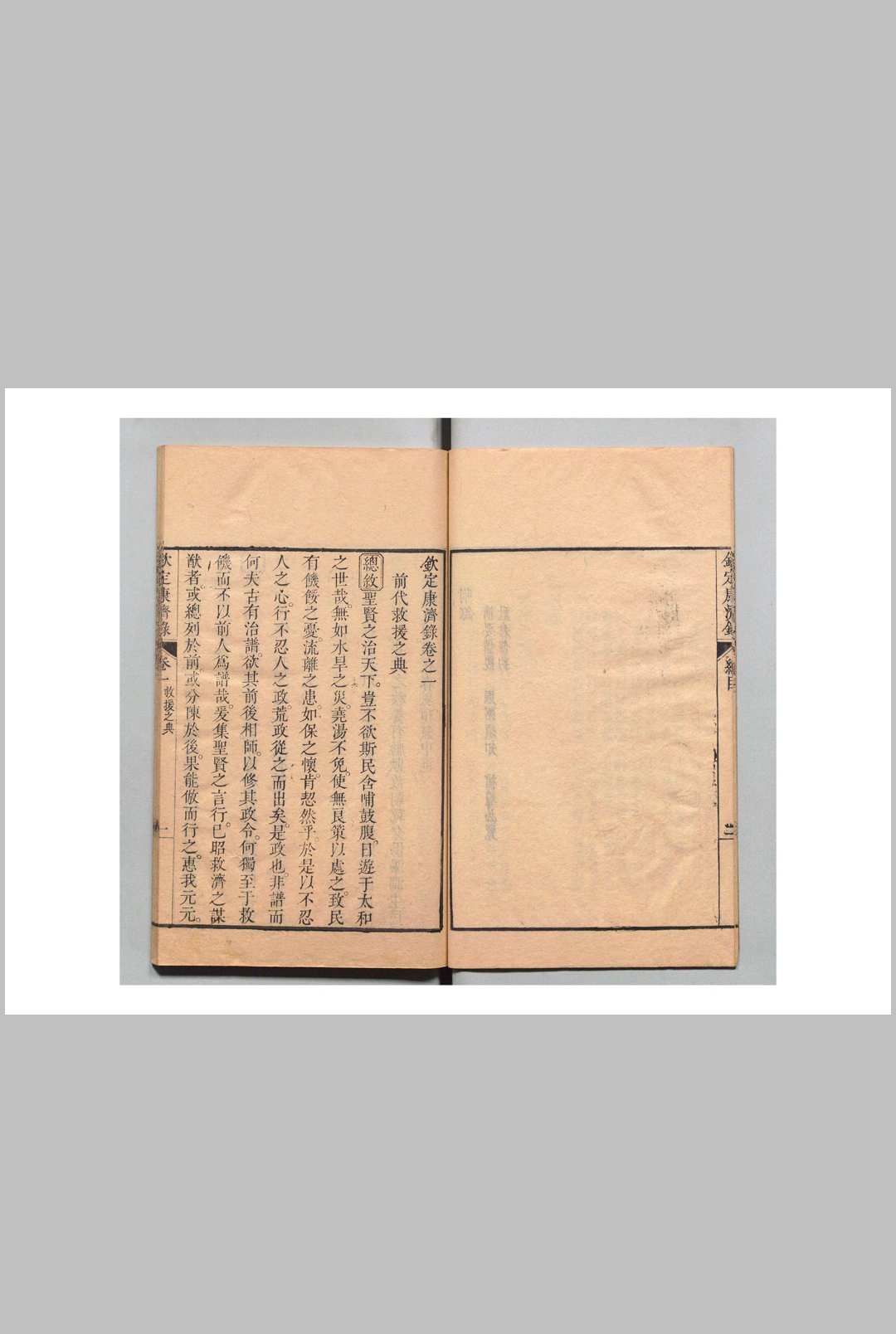 《钦定康济录》·六卷。乾隆四年御定。初,仁和监生陆曾禹作《救饥谱》,吏科给事中倪国琏为检择精要,釐为四卷。会诏翰林科道轮奏经史讲义,国琏因恭录进呈。皇上嘉其有裨於实用,命内直诸臣删润其词,剞劂颁布,因赐今名。