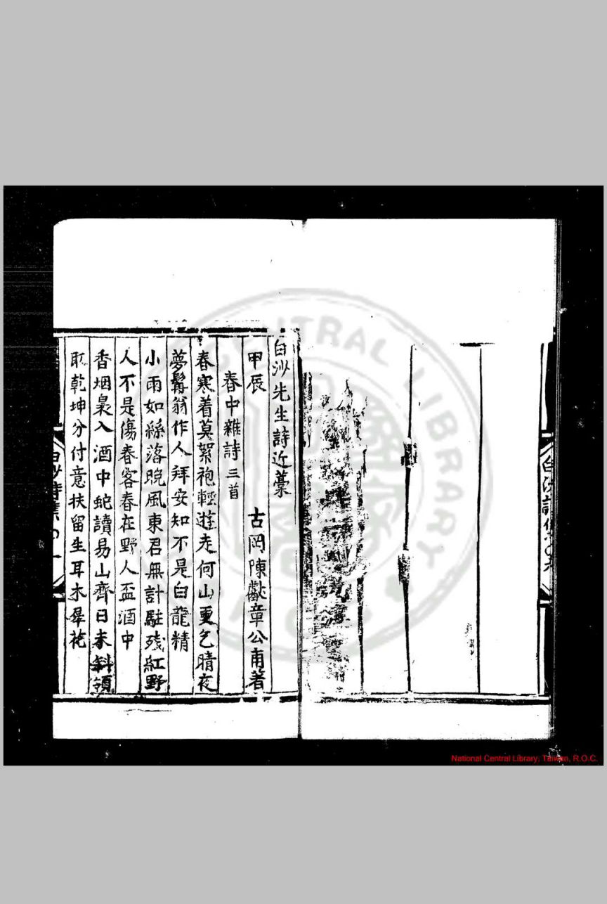 白沙先生诗稿 (明)陈献章撰 明弘治丙辰(九年, 1496)吴廷举刊本