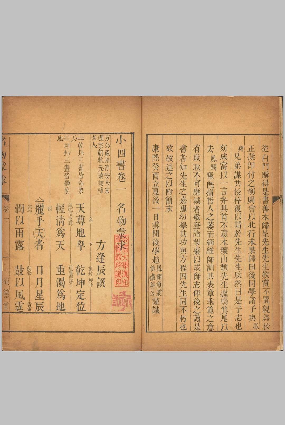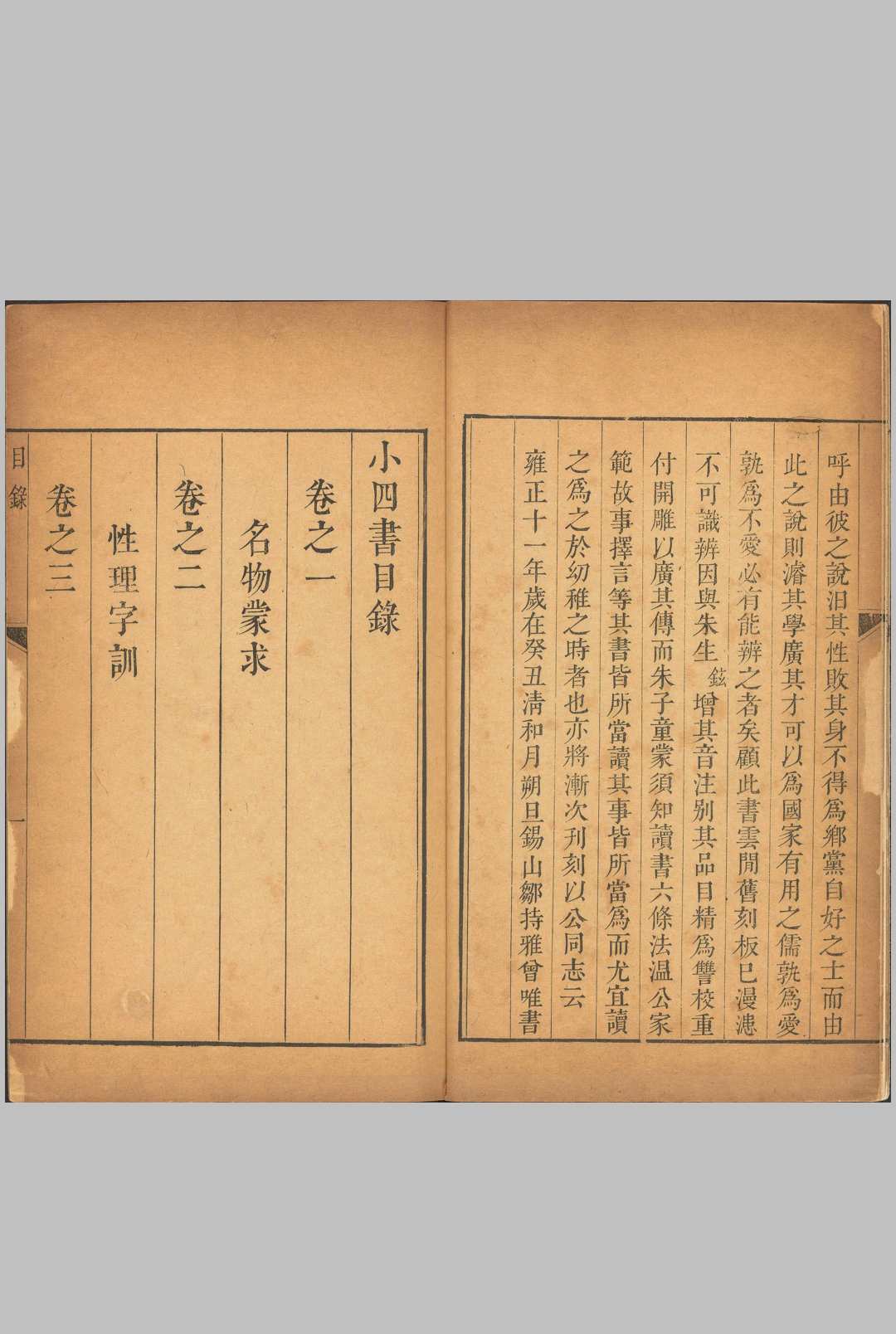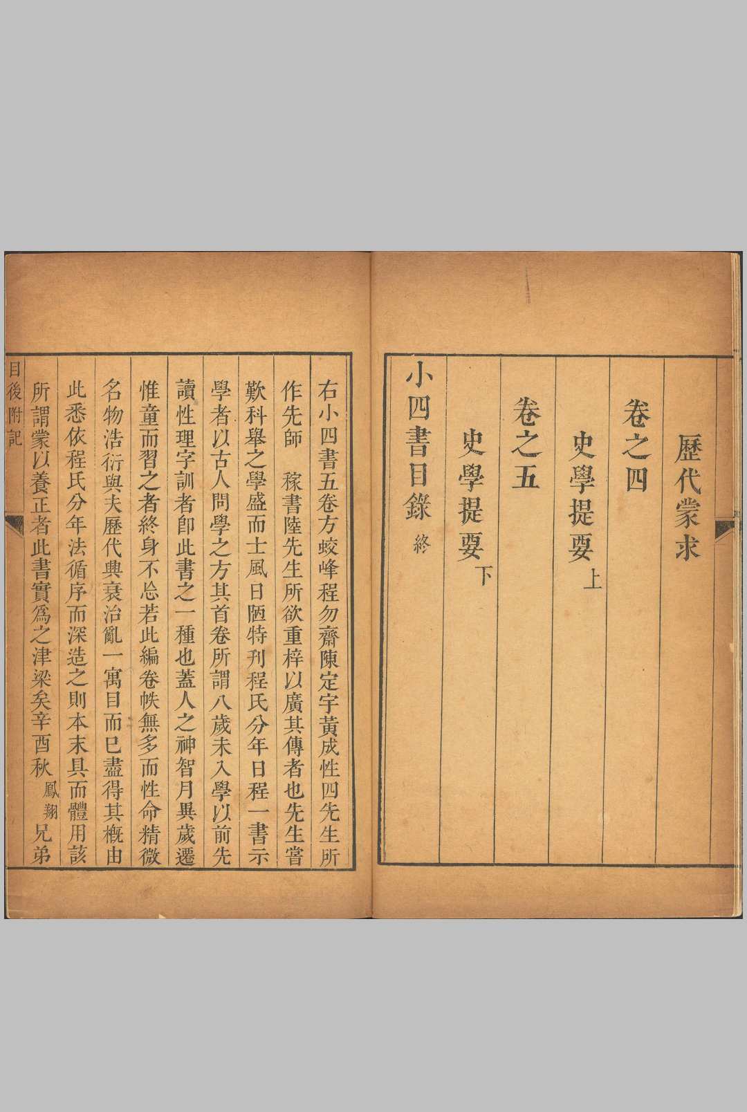 是编收宋方逢辰(号蛟峰)《名物蒙求》一卷,宋程若庸(号勿斋)《性理字训》一卷,元陈栎《历代蒙求》一卷,元黄继善(字成性)《史学提要》二卷。朱升《自序》:“首蛟峰《蒙求》,《凡将》、《急就》之俦也。名物者,小学之先也;次勿斋《理性家训》,学问,天人之道,治教之原也;次陈先生《历代蒙求》,使知古今朝代之略:次黄成性《史学提要》,使知传统事迹之详。此四书者,四字成言,幼童所识,精熟融会,宇宙在胸中矣。”为有别于宋朱熹所编《四书》,故名《小四书》。