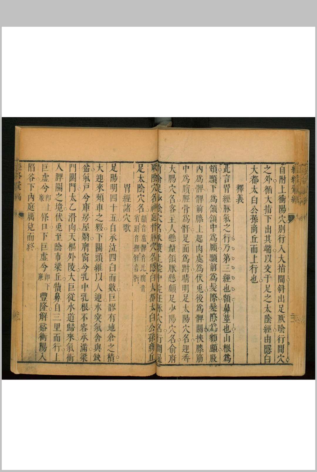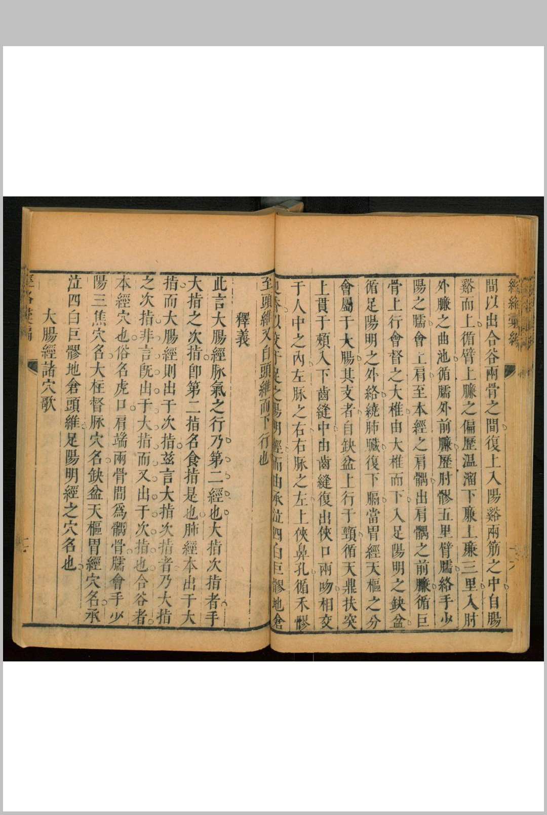针灸学著作。二册。不分卷。明·翟良撰。刊于1628年。本书联系脏腑的属性、生理特点对十四经脉的循行、属络、经穴部位和主病等予以论述。并附脏腑经脉图及歌诀、手足经起止图、内景图和奇经八脉论等。现有清刻本。