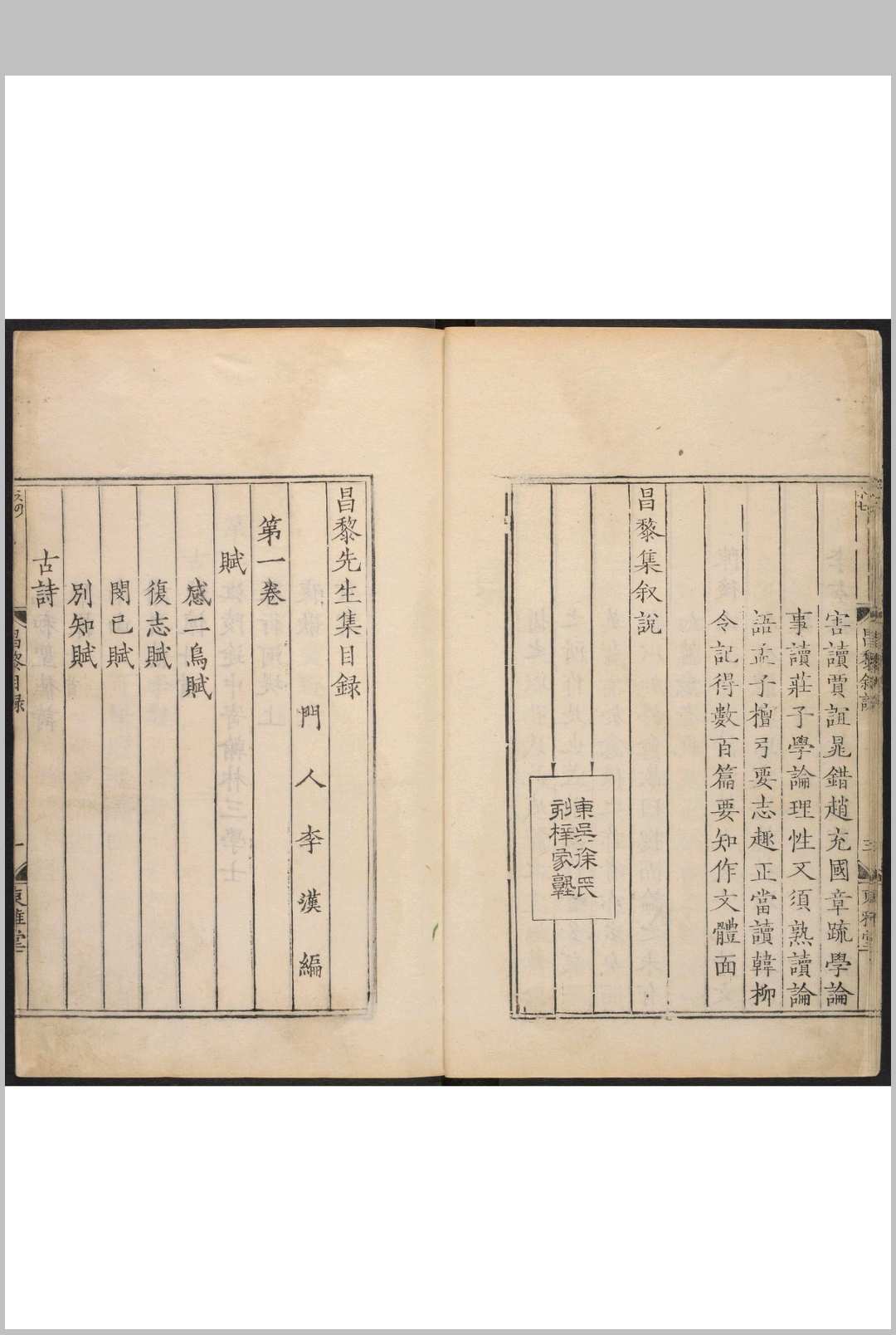 昌黎先生集 40卷, 外集 10卷, 遗文 1卷, 集传 1卷 韩愈撰 廖莹中集注 李汉编.徐时泰东雅堂, 明刊本