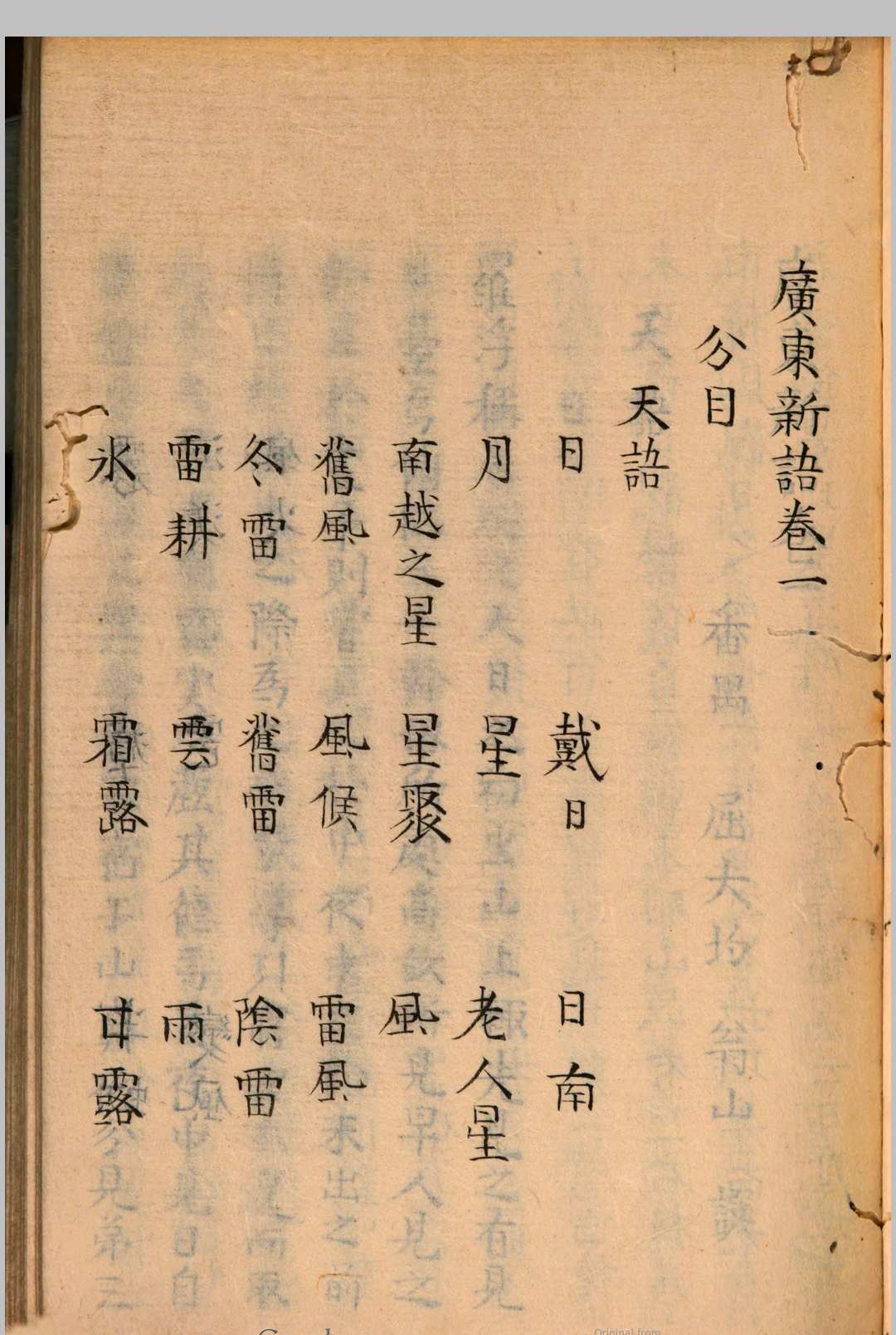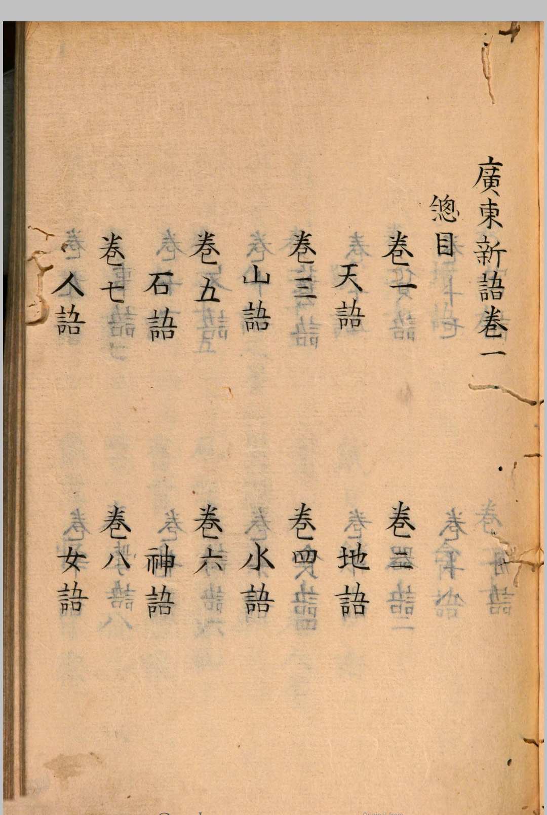 《广东新语》由清屈大均撰。《广东新语》成书于屈大均晚年(屈大均生平及诗文被禁缘由见本书《皇明四朝成仁录》,是一部有价值的清代笔记。全书共二十八卷,每卷述事物一类,即所谓一“语”,如天、地、山、水、虫鱼等。