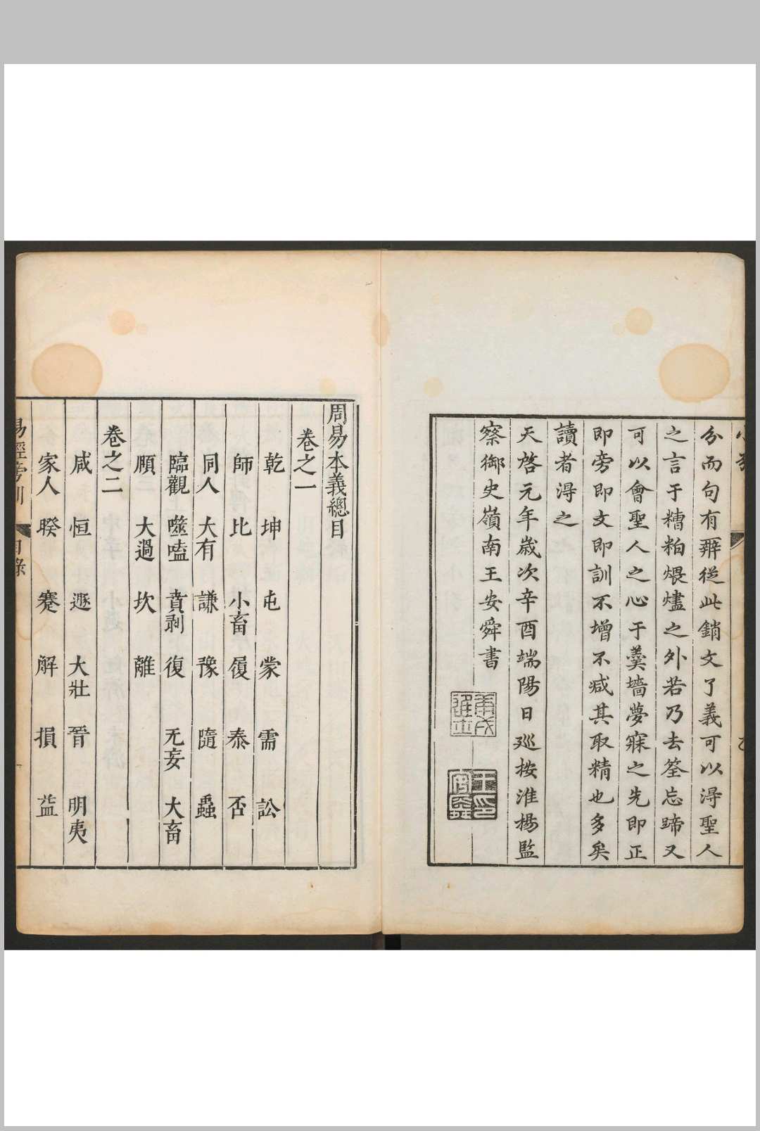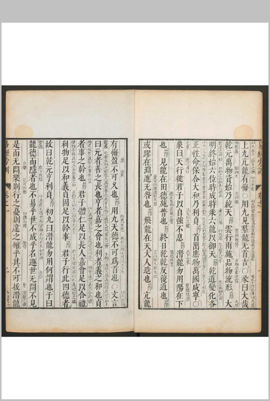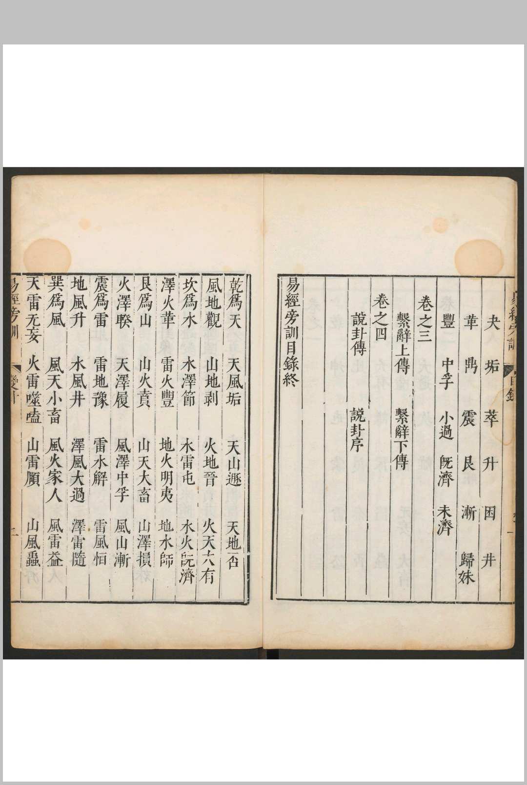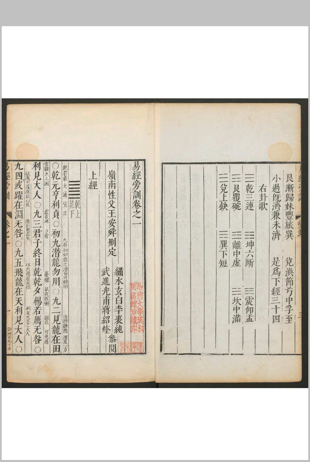 《五经旁训》由明代王安舜删定。全书共二十二卷,分为:易经旁训、书经旁训、诗经旁训、春秋旁训、礼记旁训。正文旁边附注、释义。此本大致为明天启元年刊本,部分页面有朱笔圈点。