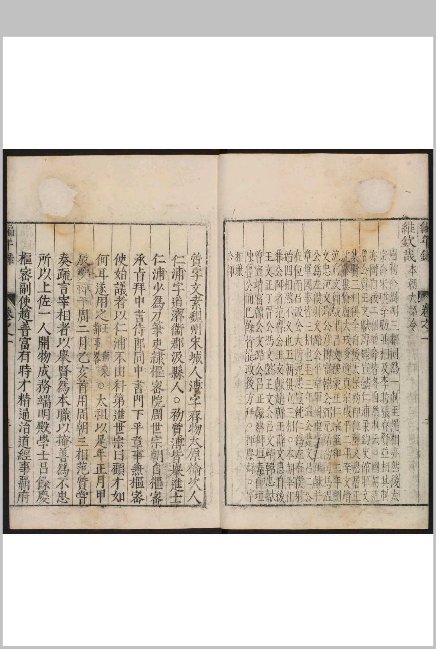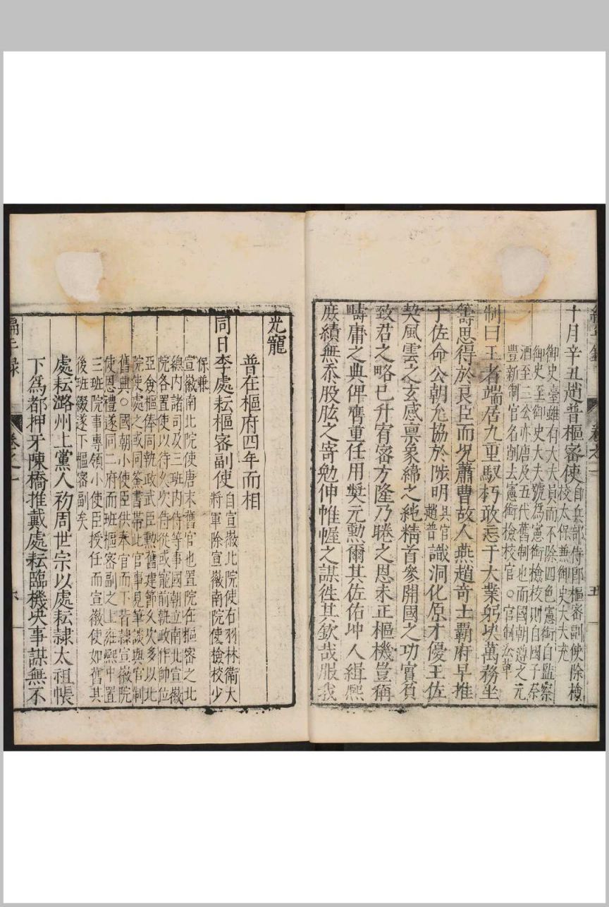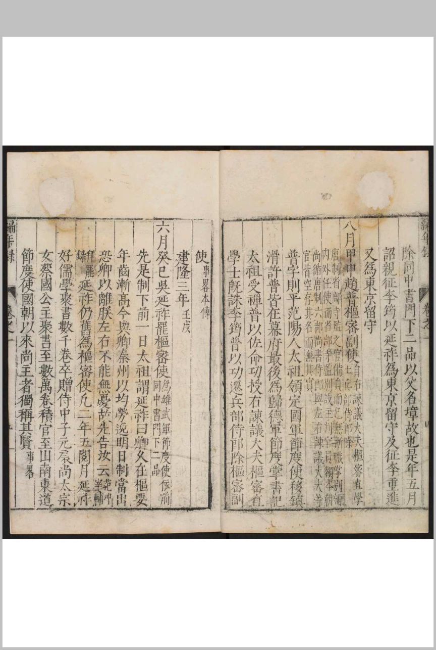 记录宋建隆元年(960年)至宋嘉定八年(1215年)二百五十多年间中书、枢密二府大臣的任免情况。宋代官制是以中书、枢密为二府,设宰辅之职,所以,以平章事、参知政事、枢密使、知枢密院事至签书枢密院事,共数以千计的宰辅,都详记其拜罢之由,各大臣的仕履及锁院制词。叙事详实,内容丰富。在叙述一个宰辅的任免时,往往博采诸家之说,并列几种记载。