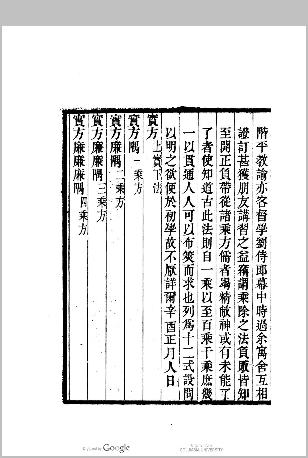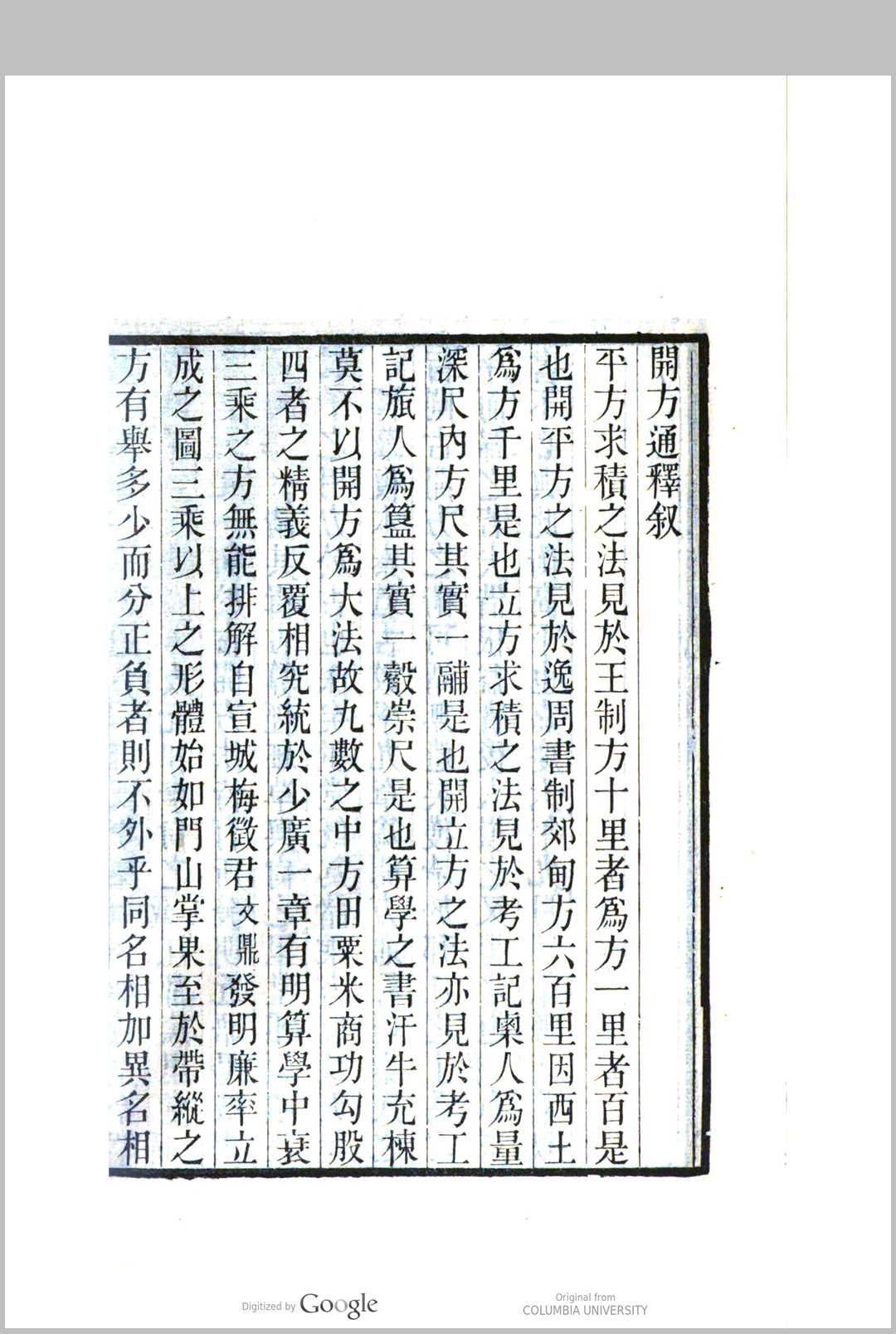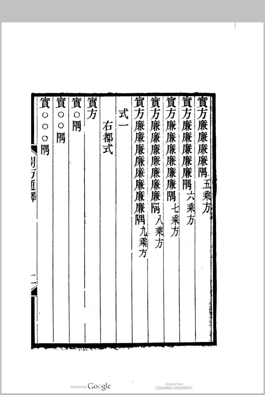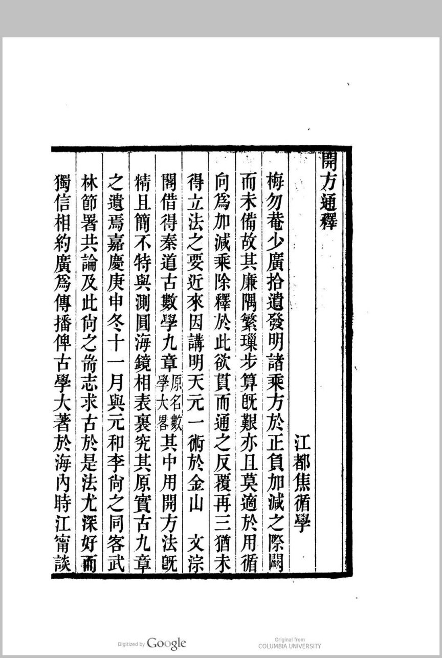 开方通释,清代阐述宋元数学中的增乘方法的著作一卷,清焦循撰.前半部分论“十二式”,每一式都列出一至十次方程并以题例及算草加以说明,是全书的核心,其中前八式实际上是八类不同形式的高次方程,后四式则是增乘开方法的几个关键步骤;后半部分主要以实例说明李冶、秦九韶“开方”方法的异同,并特别阐明了“投胎”、“换骨”、“开连枝同体术”等方法.此书有光绪六年(1880)德化李氏刊本,后又被李盛铎收入《木犀轩丛书》中。