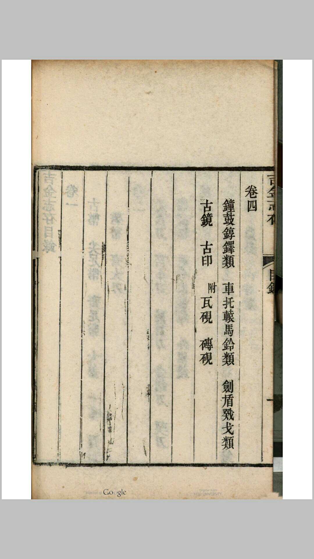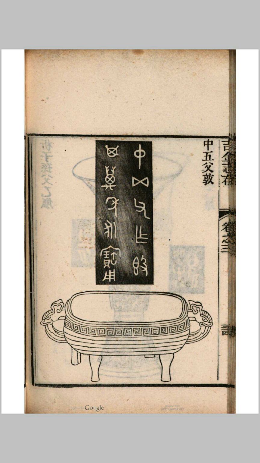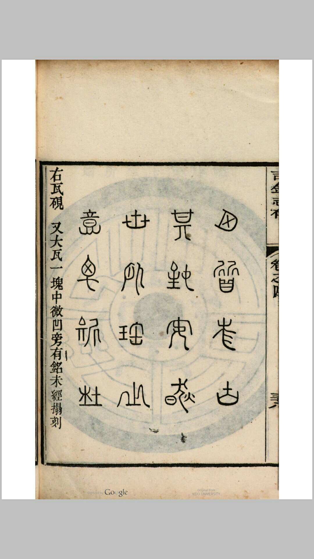 书中收录古文字、古籀文、钟鼎彝器、钱币、瓦当、秦汉印章、车马器、铜镜等物,所收器物均摹刻图形、铭文,并附有考订文字及释文,图文并茂、古意盎然 。
