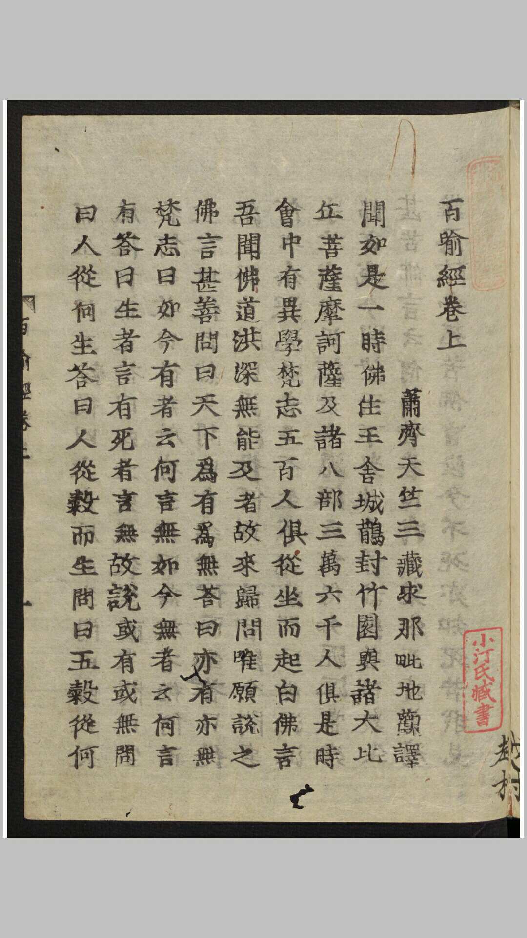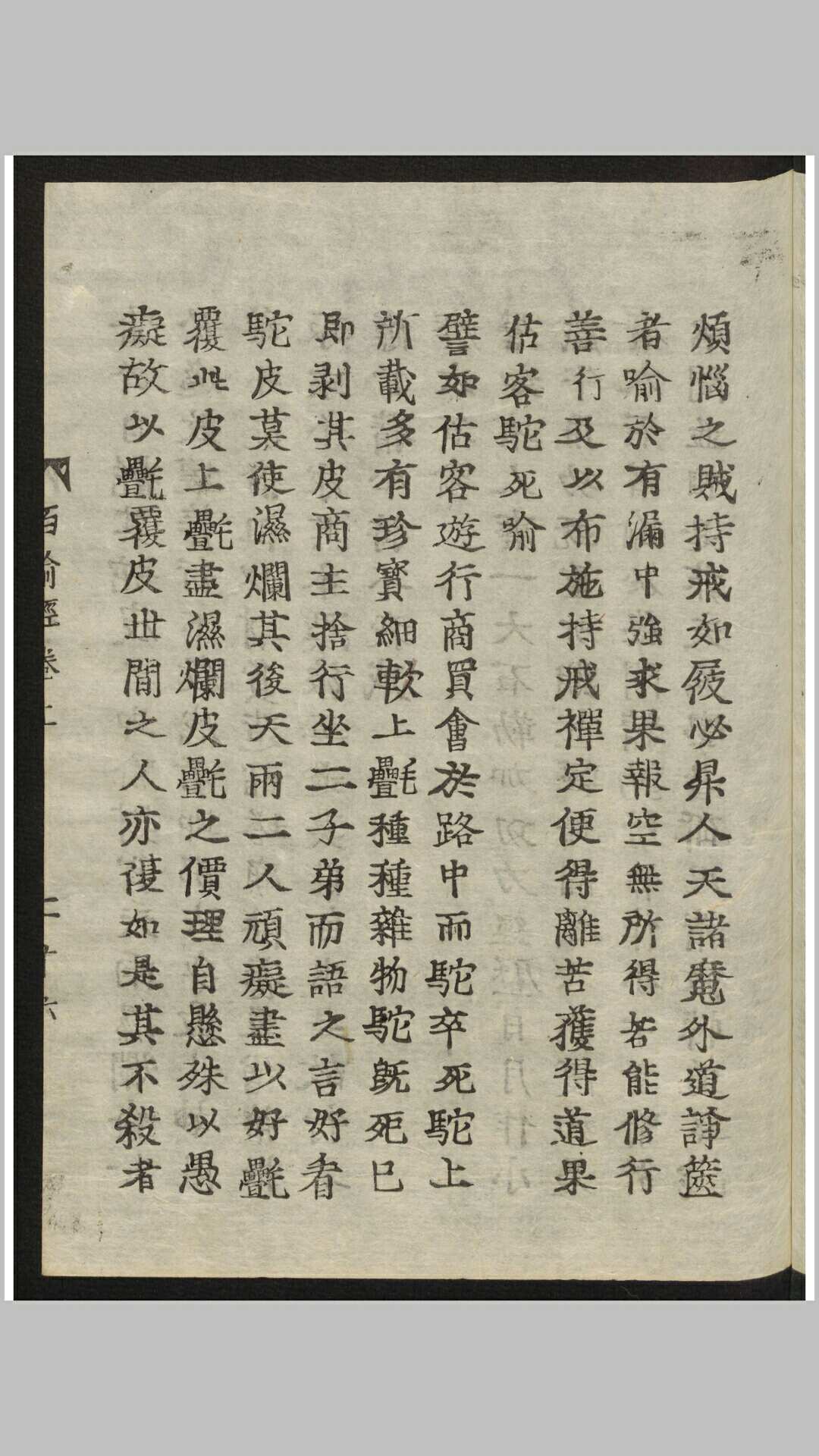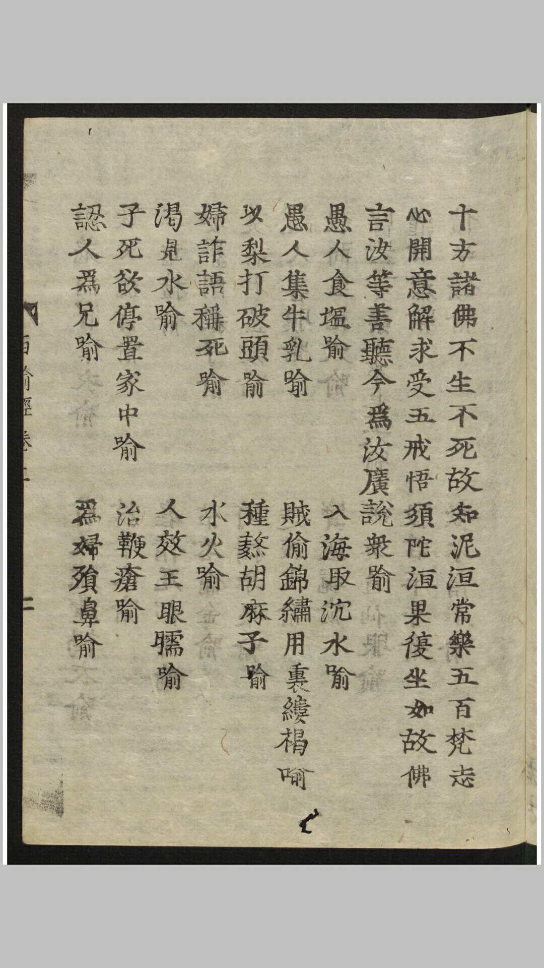 《百喻经》,全称《百句譬喻经》,是古天竺僧伽斯那撰,南朝萧齐天竺三藏法师求那毗地译。《百喻经》称“百喻”,就是指有一百篇譬喻故事,但现存的譬喻故事只有九十八篇;之所以称之为“百”,有两种说法,一就整数而言,二是加上卷首引言和卷尾偈颂共为百则。《百喻经》全文两万余字,结构形式单一,每篇都采用两步式,第一步是讲故事,是引子,第二步是比喻,阐述一个佛学义理。它从梵文译成汉文,距今已经有一千五百多年的历史。
