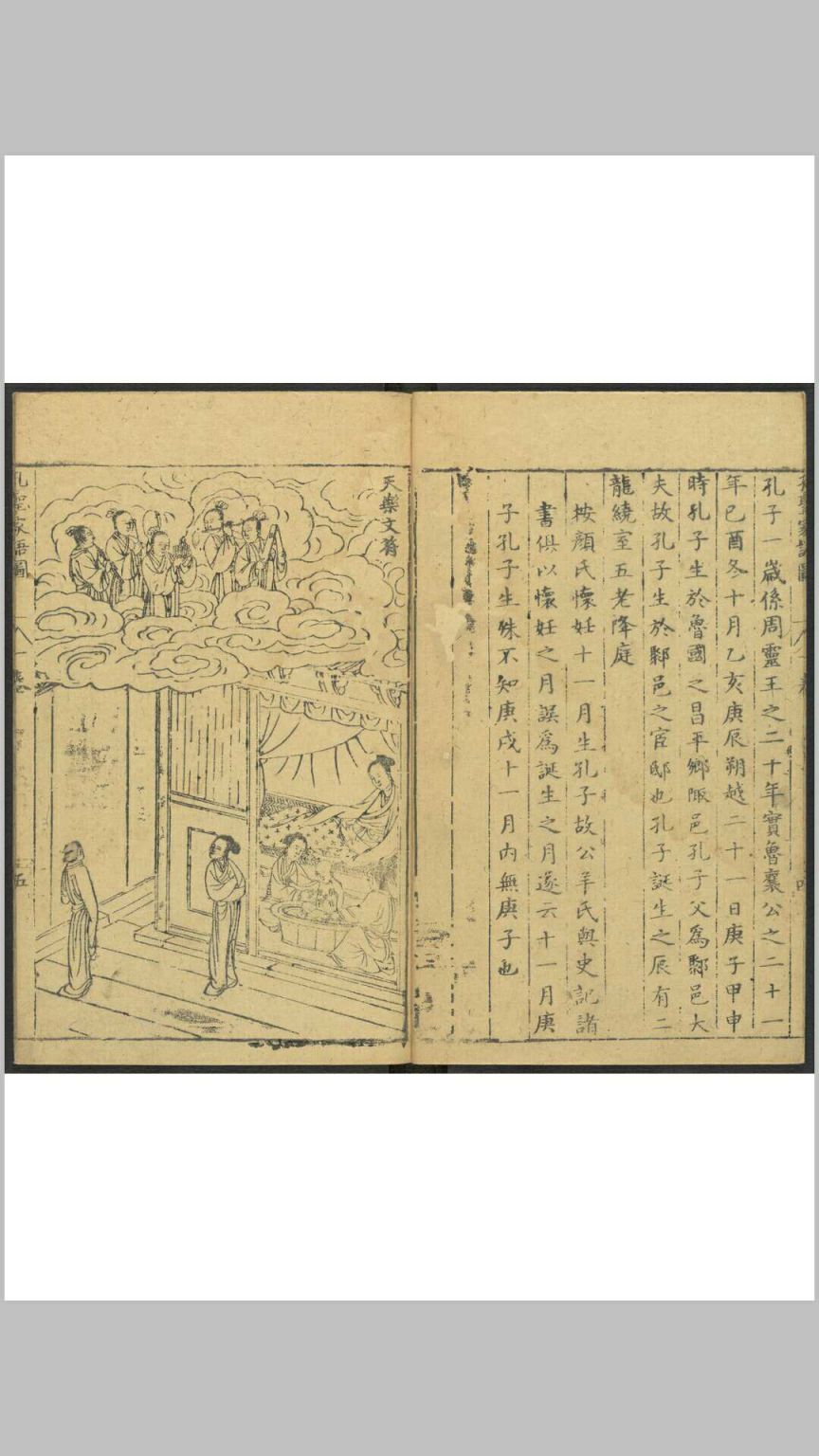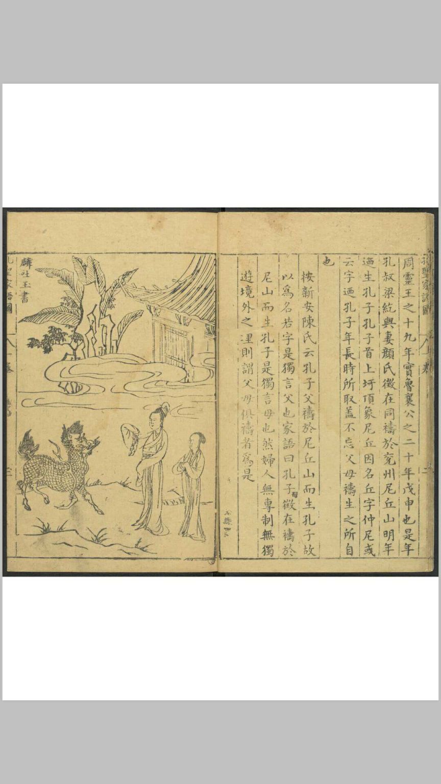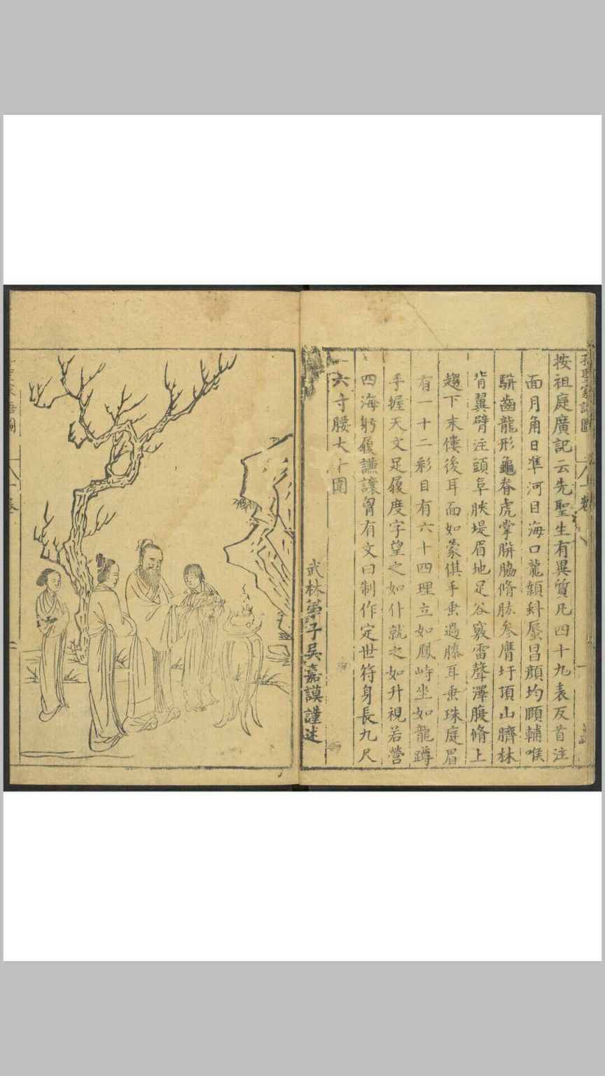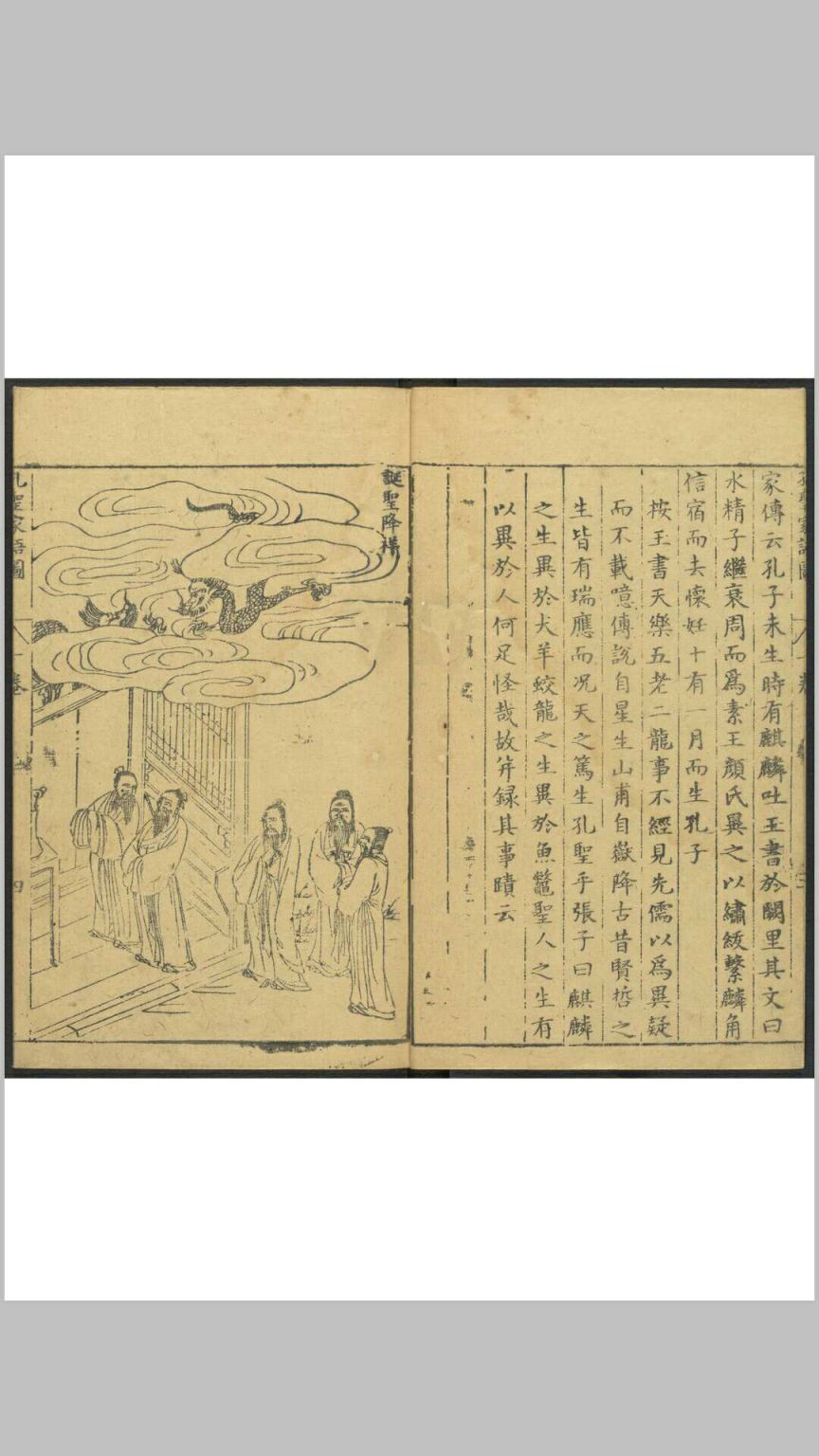 《孔圣家语图》由明吴嘉谟于万历十七年(1589)集校后刻印,共十一卷,卷一为孔子图录,下十卷为文字,即“孔子家语”。其图录绘孔子一生自诞生到逝世共40幅画,一面为图,一面为传文及按语,由程起龙伯阳绘写,歙人黄组镌刻。
