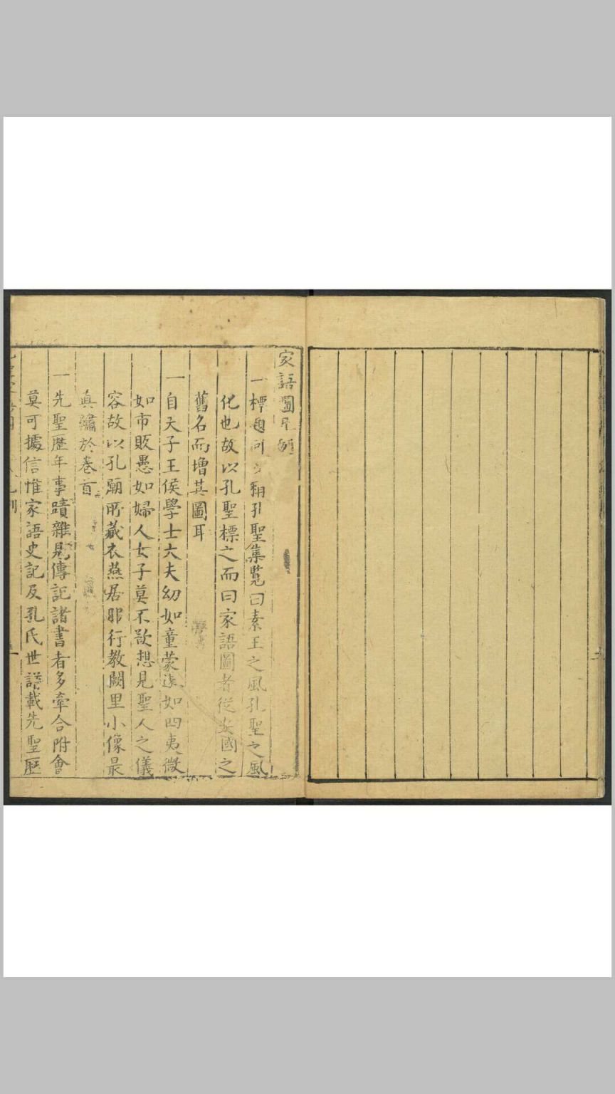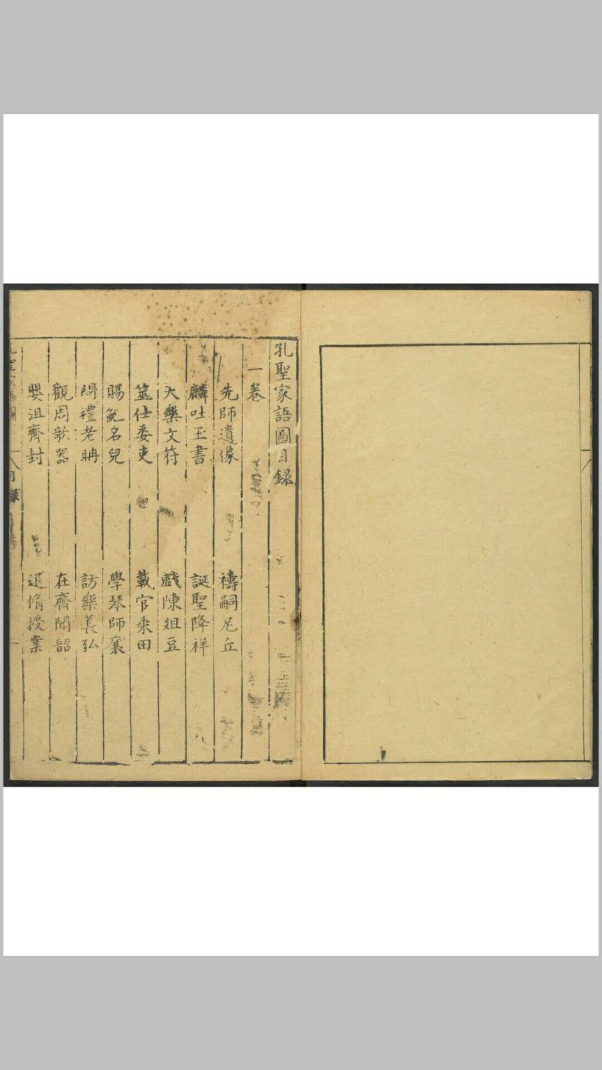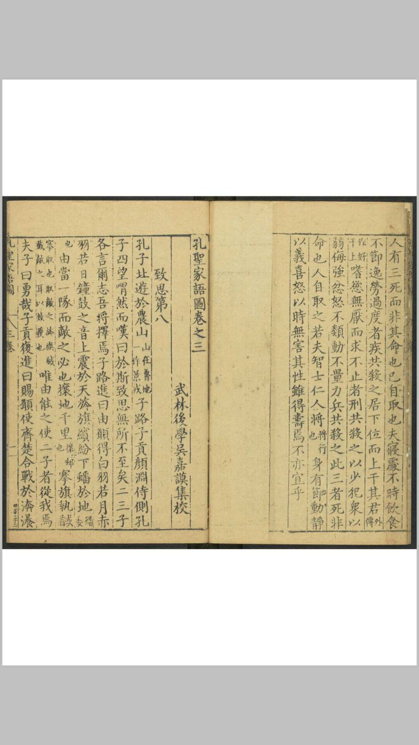 《孔圣家语图》由明吴嘉谟于万历十七年(1589)集校后刻印,共十一卷,卷一为孔子图录,下十卷为文字,即“孔子家语”。其图录绘孔子一生自诞生到逝世共40幅画,一面为图,一面为传文及按语,由程起龙伯阳绘写,歙人黄组镌刻。