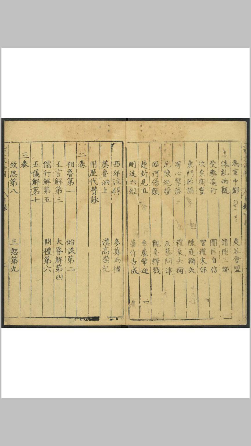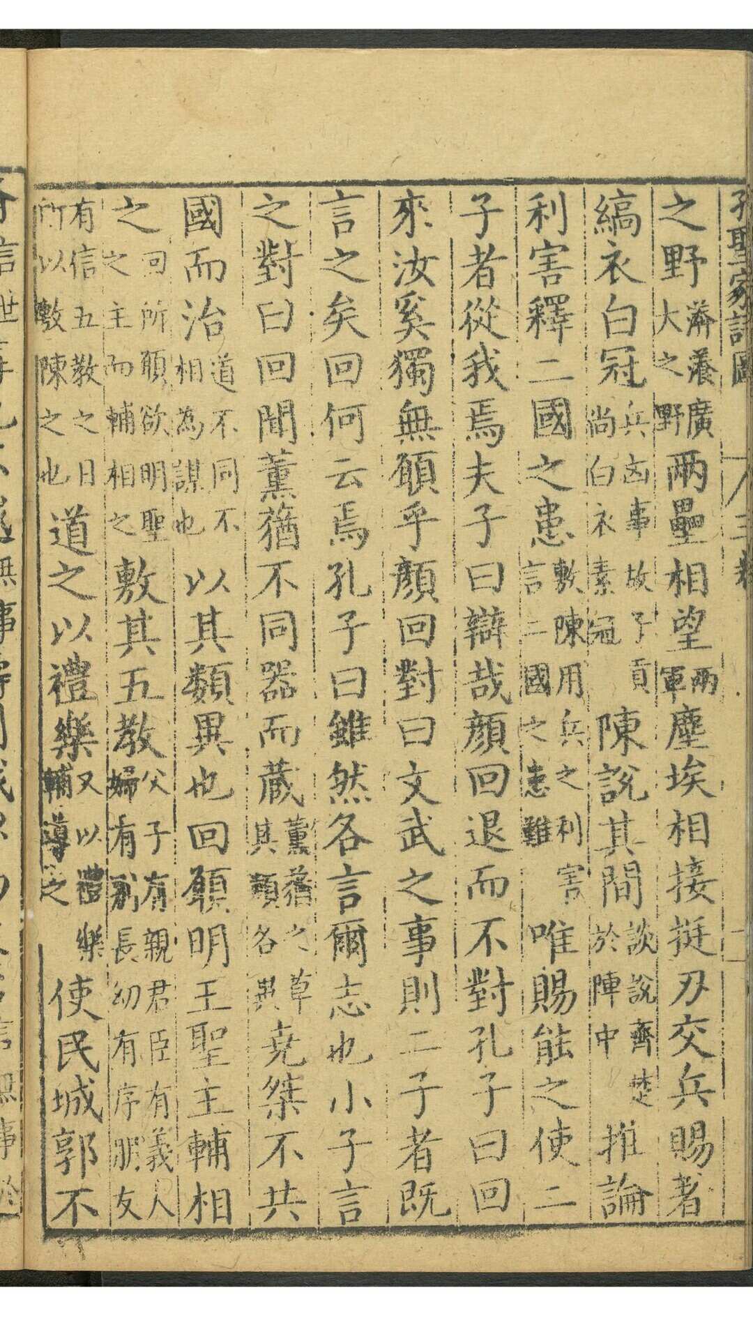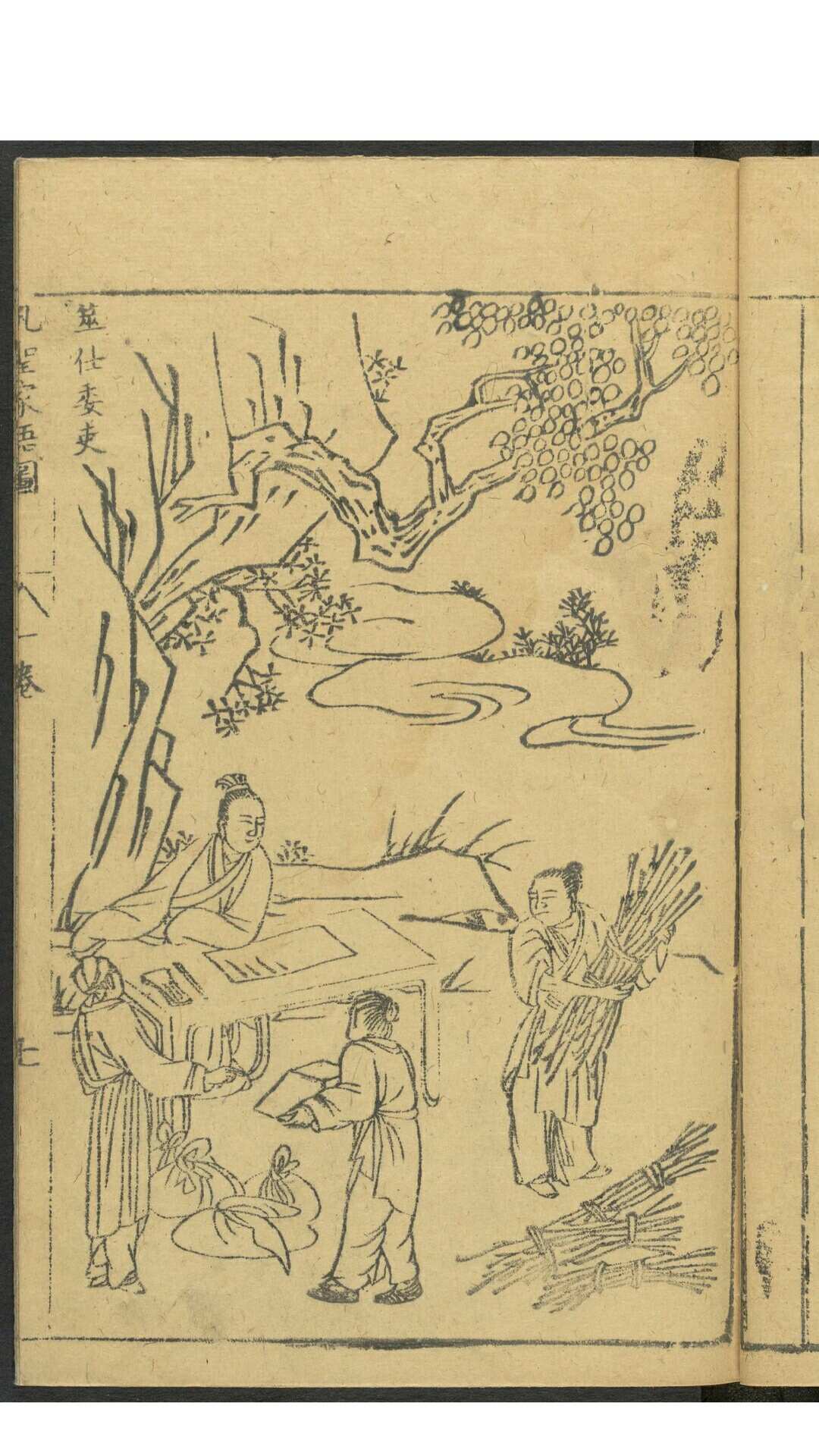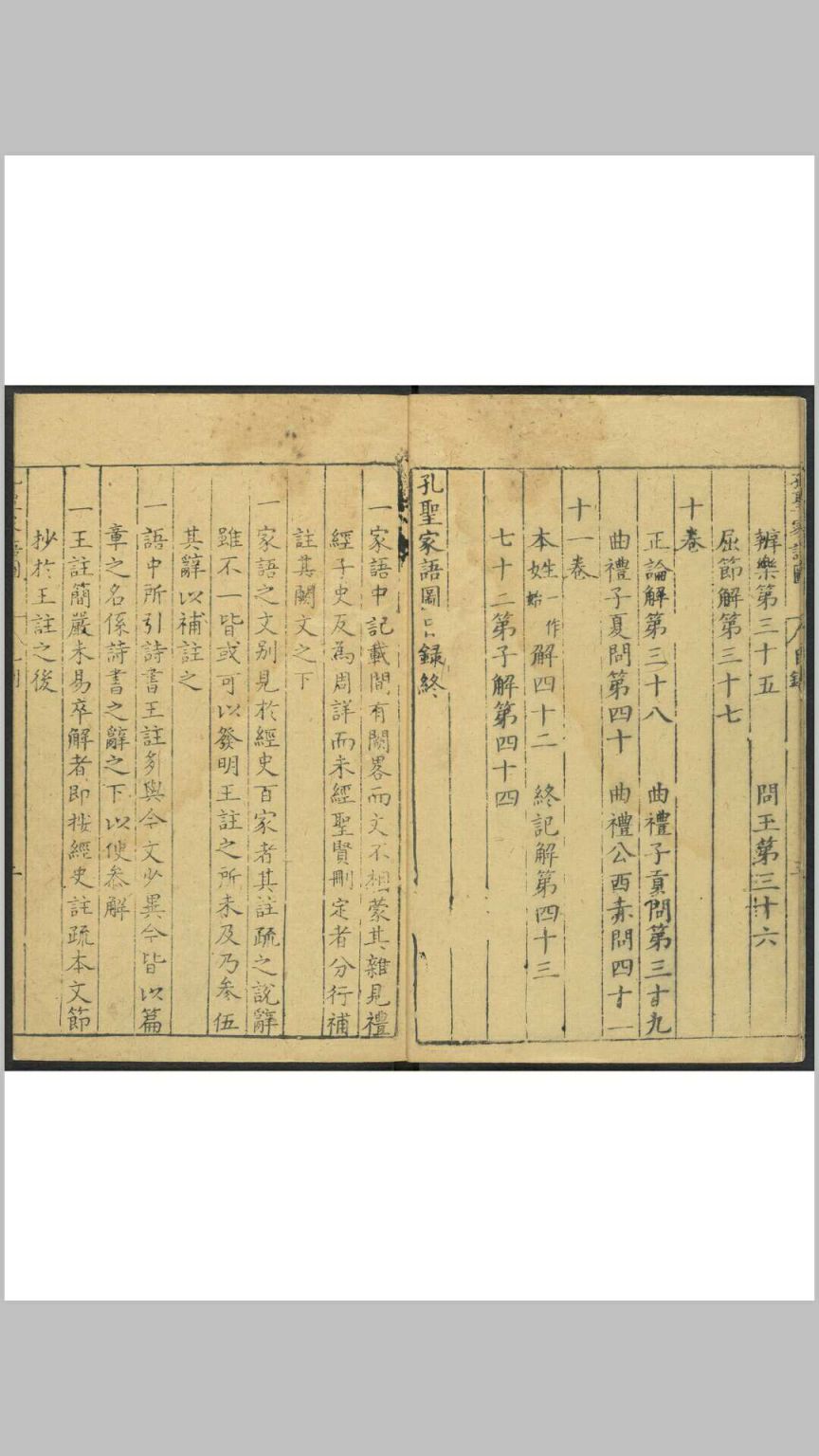 《孔圣家语图》由明吴嘉谟于万历十七年(1589)集校后刻印,共十一卷,卷一为孔子图录,下十卷为文字,即“孔子家语”。其图录绘孔子一生自诞生到逝世共40幅画,一面为图,一面为传文及按语,由程起龙伯阳绘写,歙人黄组镌刻。