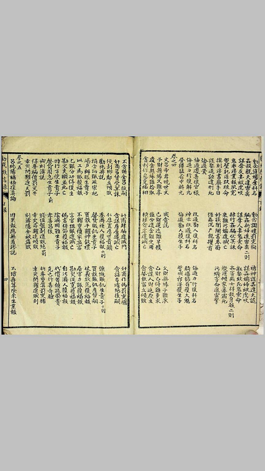 四卷戒贪。盖淫虽首恶,而为利招尤,实较渔色获咎者更多。是不可不即安义命,及奸贪受报者,以为法戒。然贪孽虽祛,欲积功行,还须为善,故继之以劝施济。前录富人乐施福报,後录贫人克己行善奇验。依此而行,见天下人人皆能施济,可以造福无量。末附刻薄之罚,以昭炯戒。