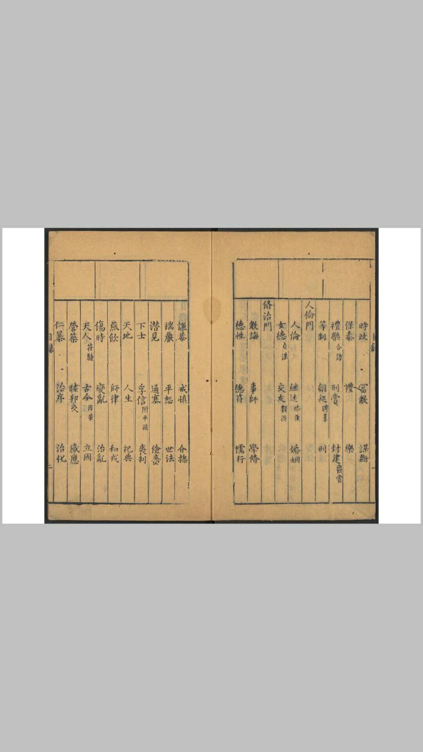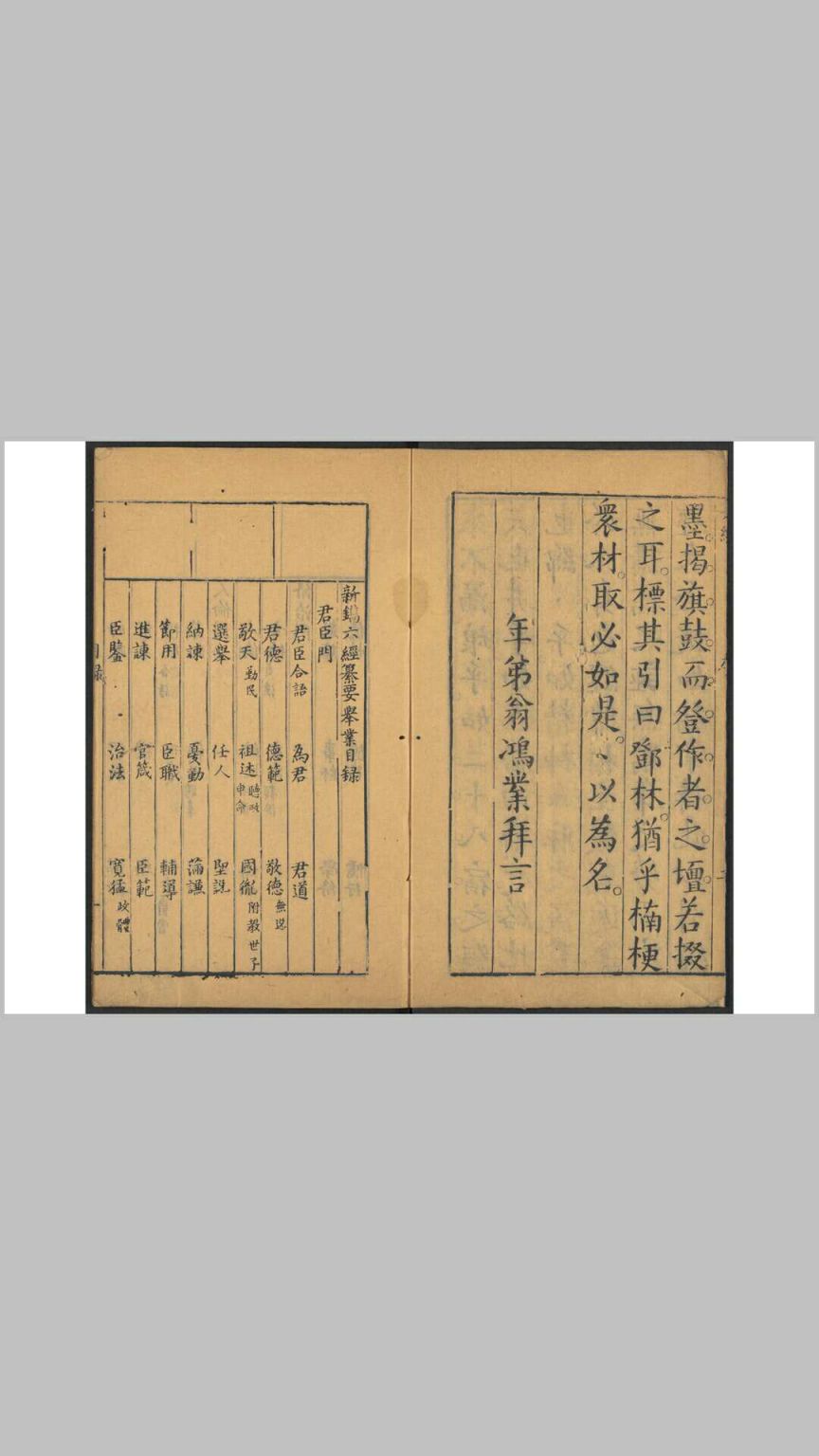 明颜茂猷(生卒年不详)撰。颜茂猷著有《迪吉录》。本书分君臣、人伦、修治三门。书自序云:稽古之力,食报于诸圣人,所见亦云浅矣。