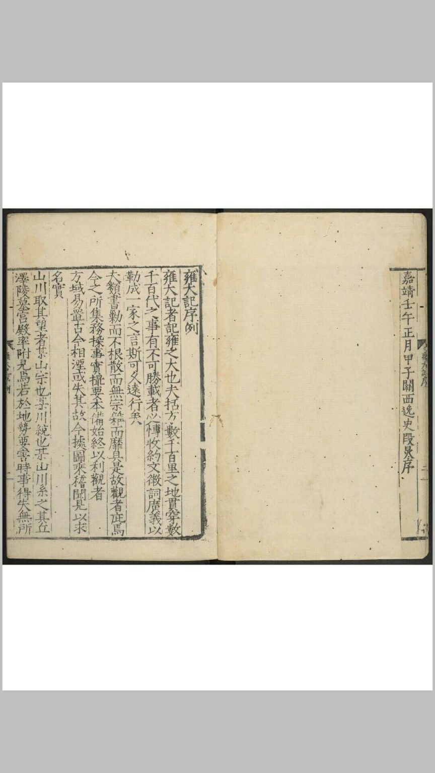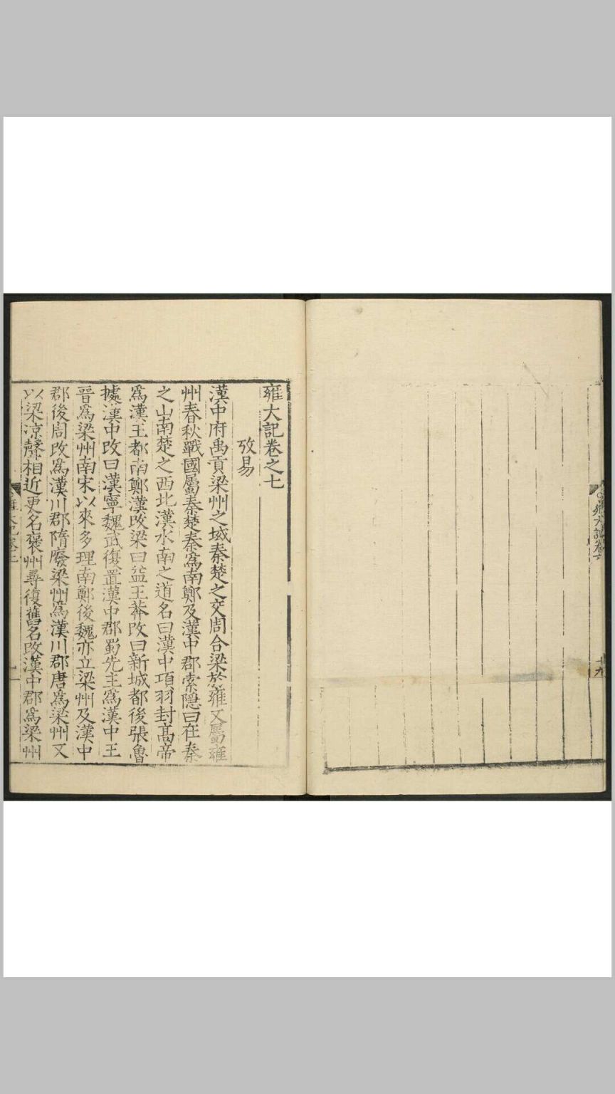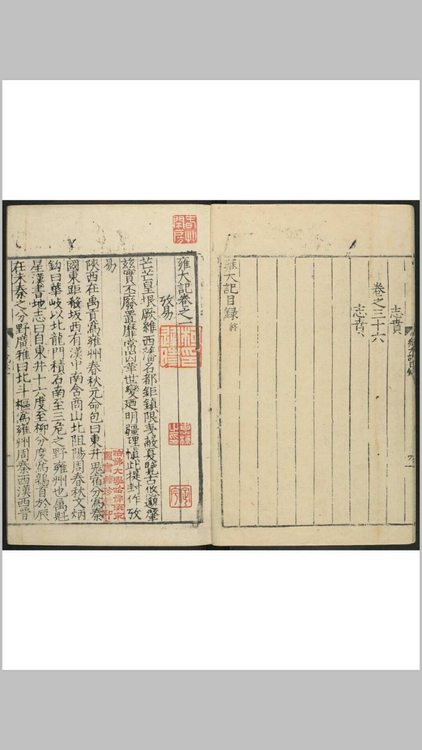 《雍大记》为明代何景明所纂修。共三十六卷。明嘉靖元年(1522年)刊刻。此书为何景明担任陕西提学副使时所修,当时为修陕西通志开局立例,他召集学官生徒分辑成此编。后因病去官,由佥(qiān)事周宗化摄学政续成之。卷首为序,卷一至卷八为考易,卷九至卷十三为考迹,卷十四至卷十八为纪运,卷十九至卷二十五为纪治,卷二十六至卷三十为志献,卷三十一至卷三十六志贲(bì)。记述范围为陕西关中,古称雍州,故名《雍大记》。清《四库全书总目提要》称其“嗜博务多”、“收入未免泛滥”,“改沿革志曰考易,改艺文志曰志贲,名目皆出臆创”。但此志于关中长安之事广为搜集,无所不载,具有重要的史料价值。