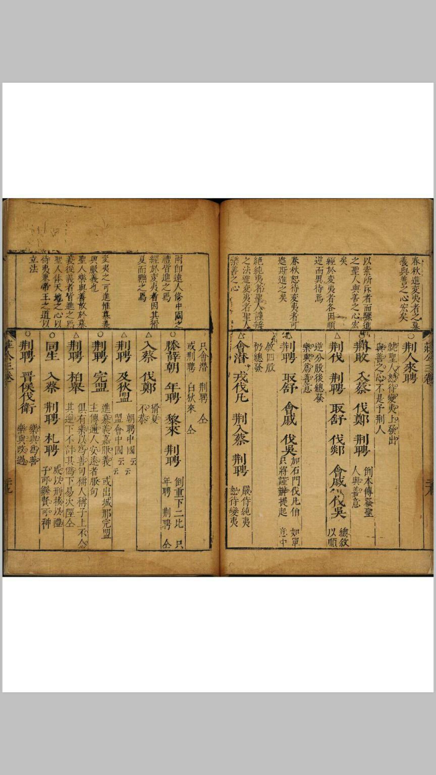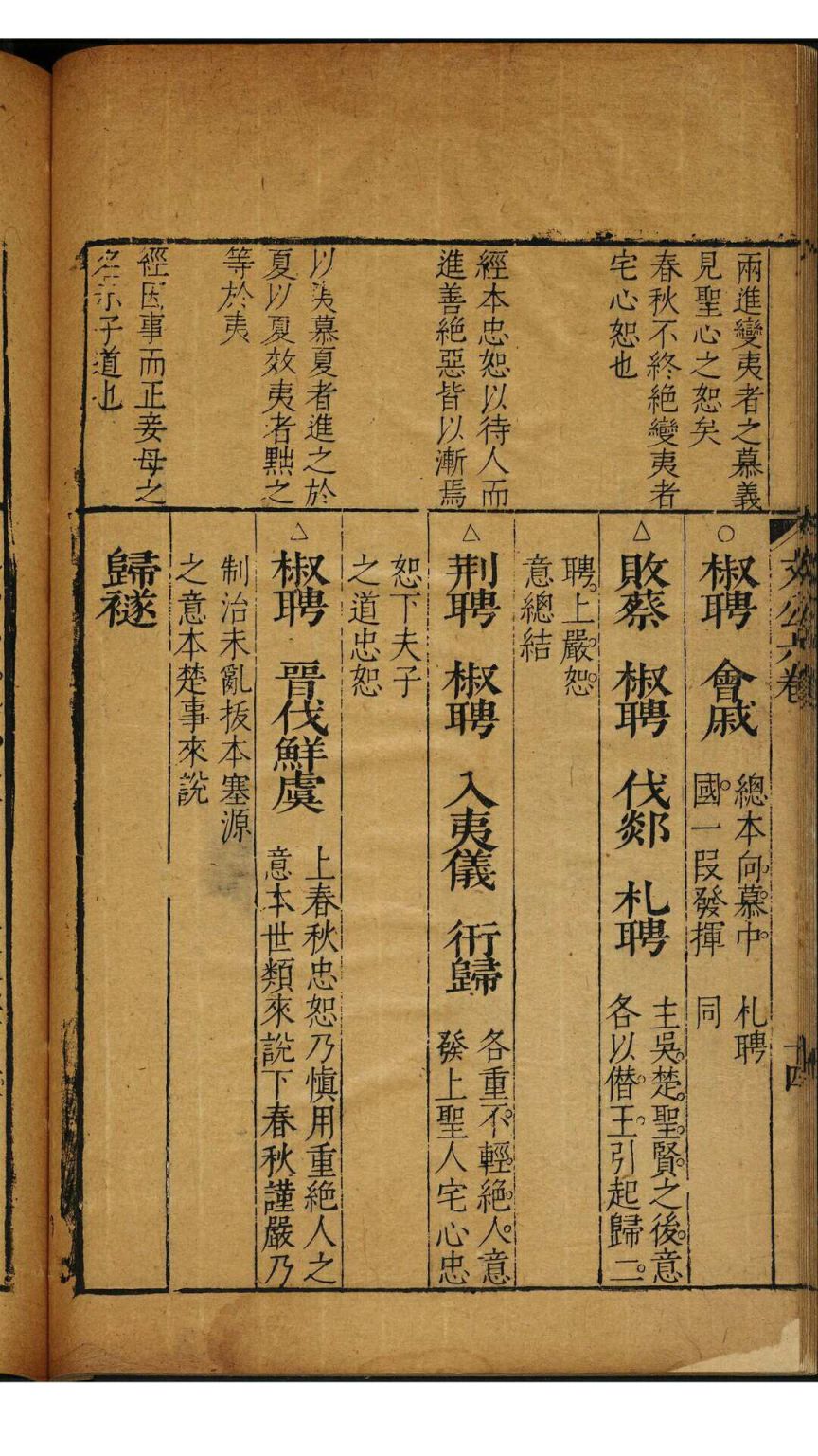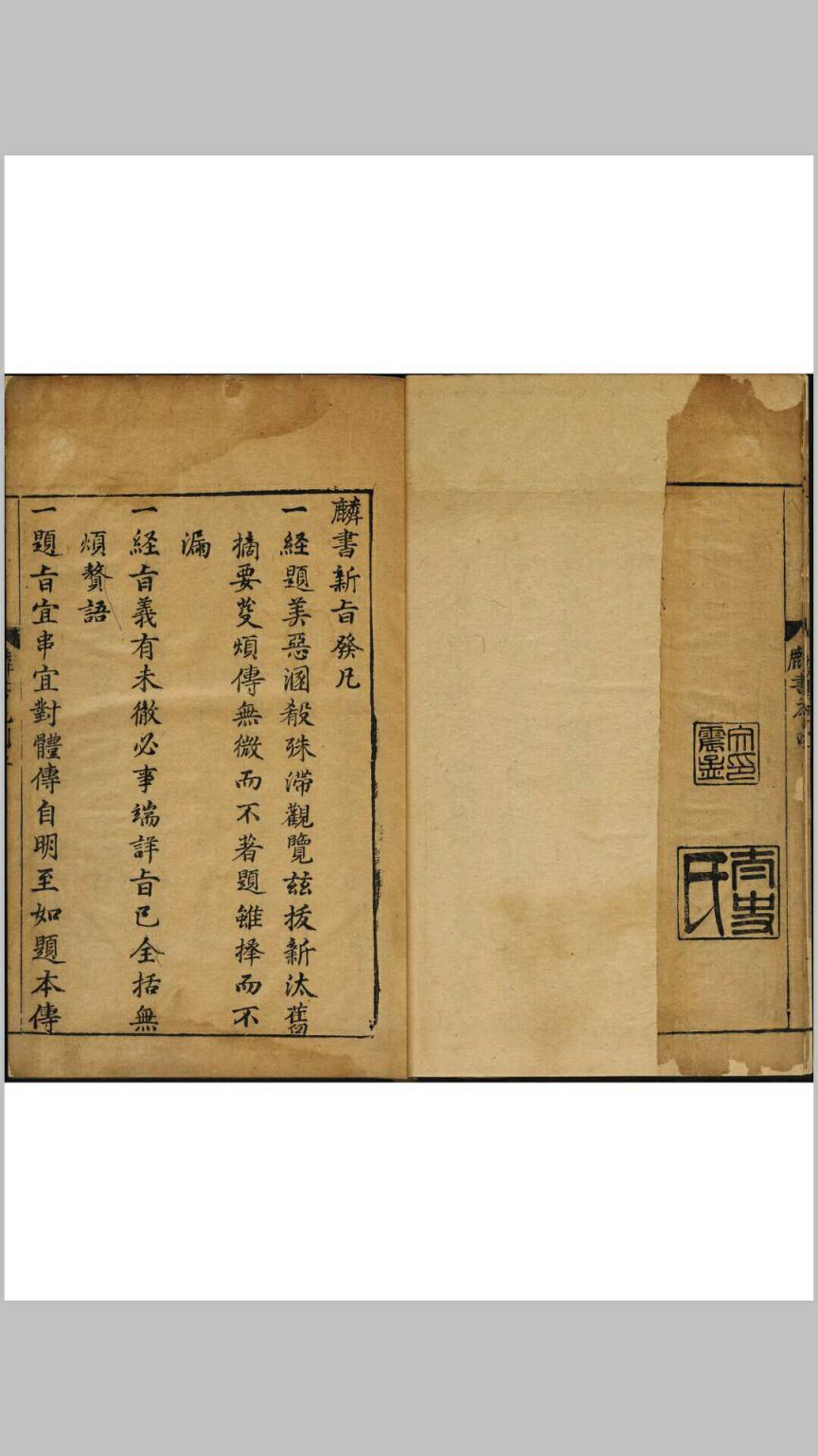 《春秋》又称《麟经》或《麟史》。麟书者,孔子以东迁而作。始于隐终于哀,绝笔于获麒麟之季,故谓之麟书。此《麟书捷旨》共12卷,官裳撰,文震孟校定。摘录《春秋》中精华部分并作注解(书眉上刻评)。此为明天启年间金陵李良臣刊刻本。