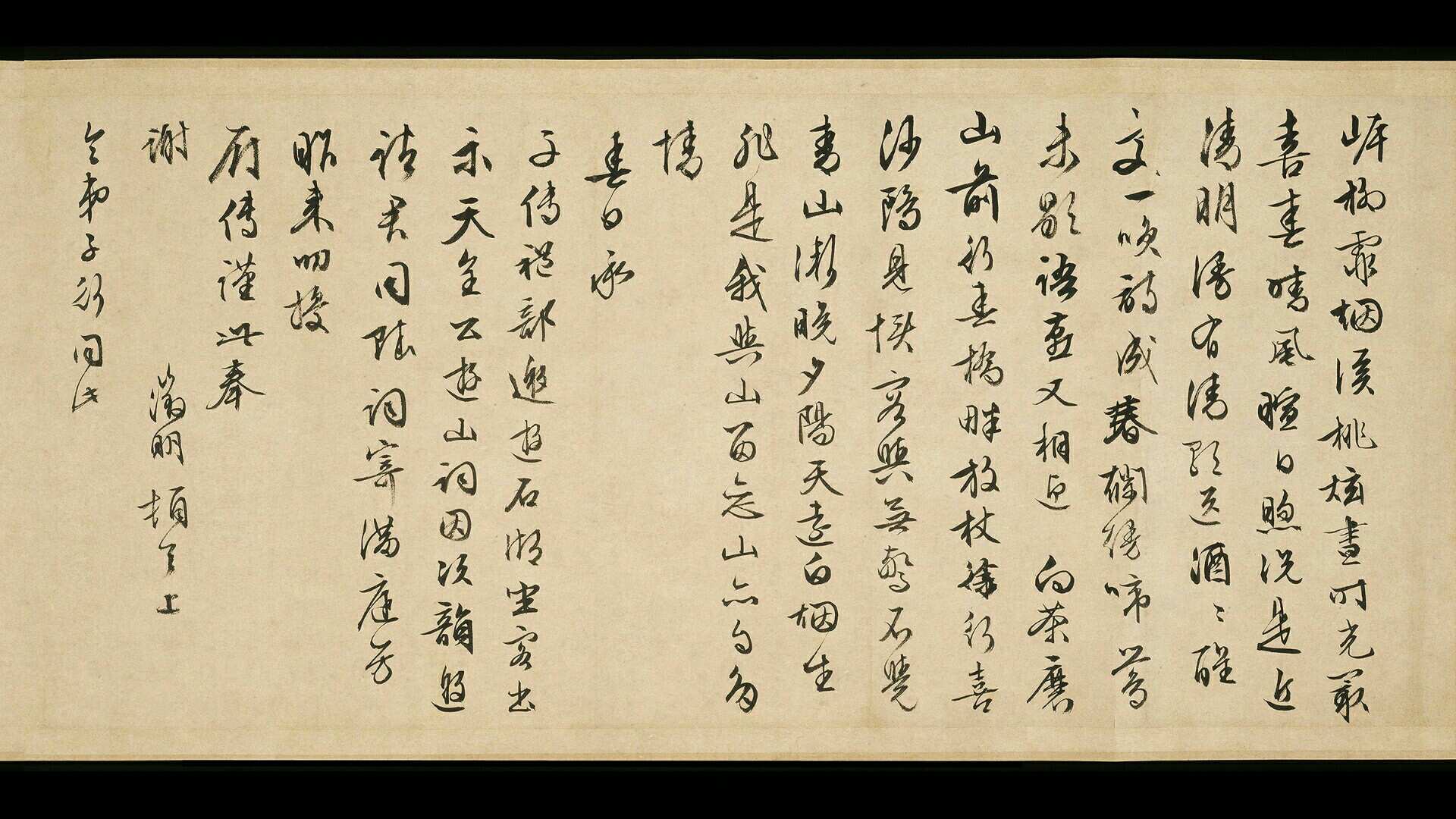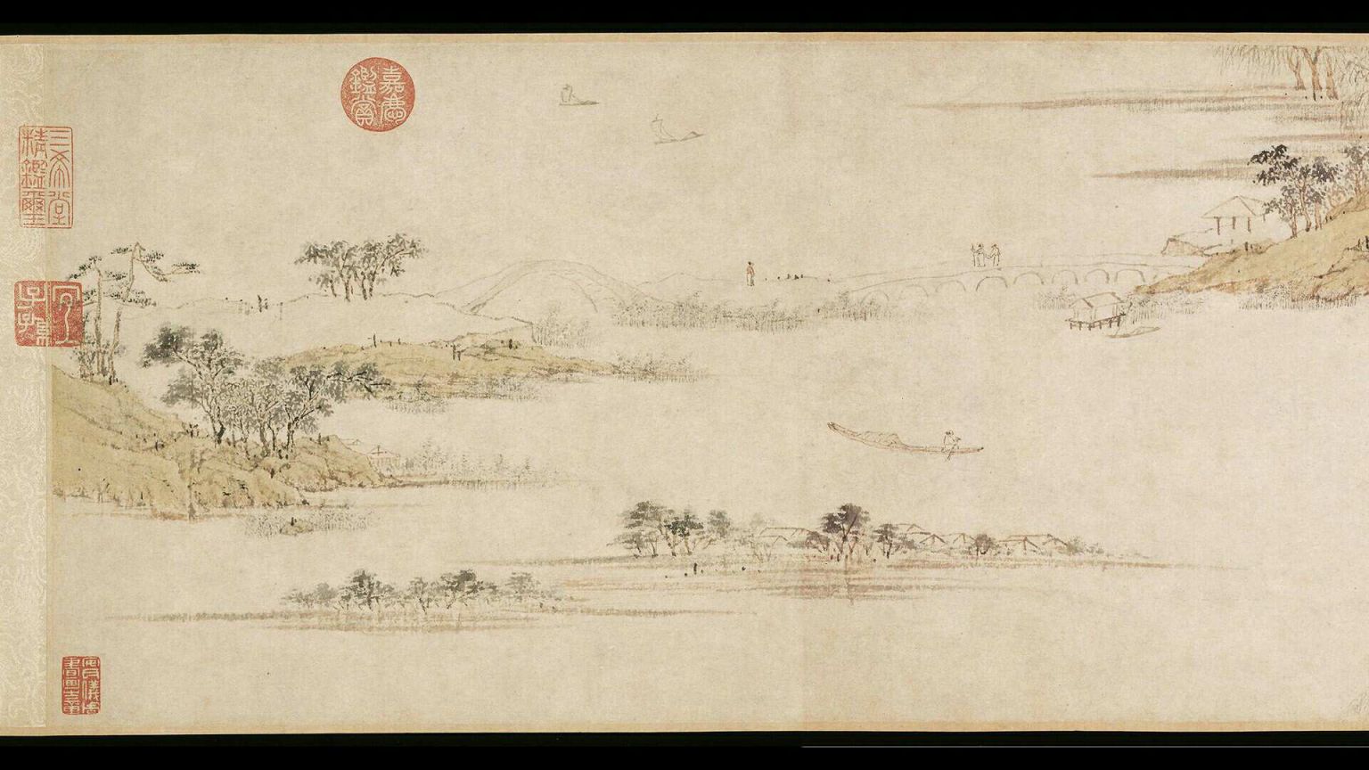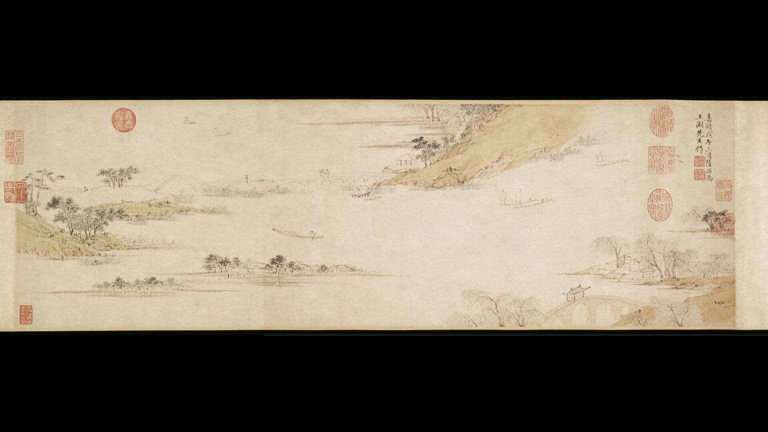 29.7X300厘米,嘉靖戊午(1558年)为陆师道作,波士顿美术馆藏。 陆治(1496~1576),字叔平,号包山,吴县(今江苏省苏州市)人。陆治工诗文,善行、楷书法,绘画学文徵明,他的山水既受吴门派影响,也吸取宋代院体和青绿山水之长,用笔劲峭,景色奇险,意境清朗,自具风格。