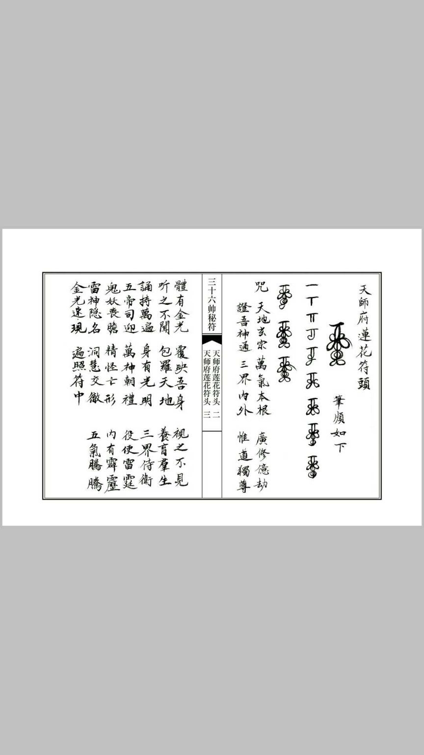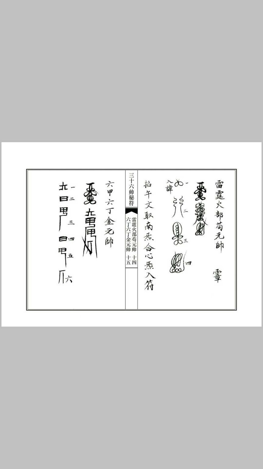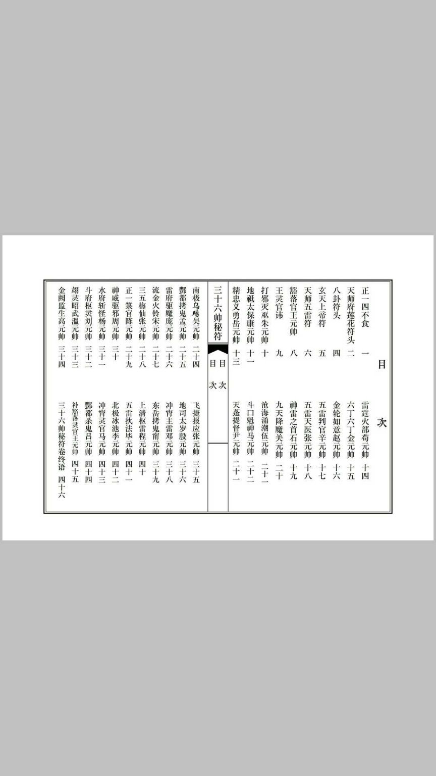 内容:正一天师莲花符.三十六帅画符程序 天师五雷符头画法,八卦符头画法,天师符秘讳字,三十六帅符秘,天师五雷符符秘结构,天师五路招财符符秘结构,豁落灵官王元帅符几种画法及符秘,玄天上帝符画法及符秘,金轮如意赵元帅符几种画法及符秘,斗口魁神马元帅几种画法及符秘,地司太岁殷元帅符画法及符秘,翊宁昭武温元帅符画法及符秘,神威驱邪邹元帅符画法及符秘,飞捷报应张元帅符画法及符秘,五雷执法毕元帅符画法及符秘,雷霆火部苟元帅符画法及符秘,荡瘟灭魔周元帅符画法及符秘,九天降魔关元帅符画法及符秘,冲霄主雷邓元帅符画法及符秘,五雷判官辛元帅符画法及符秘,金阙监生高元帅符画法及符秘,打邪灭巫朱元帅符画法及符秘,雷府驱魔庞元帅符画法及符秘,斗府枢灵刘元帅符画法及符秘,地祇太保康元帅符画法及符秘,丰都拷鬼孟元帅符画法及符秘,丰都杀鬼吕元帅符画法及符秘,东岳拷鬼孟元帅符画法及符秘,沧海湧潮伍元帅符画法及符秘,天篷提督尹元帅符画法及符秘,南极乌旸吴元帅符画法及符秘,上清駆雷程元帅符画法及符秘,正一箓官陈元帅符画法及符秘,五雷天医张元帅符画法及符秘,流金火鈴宋元帅符画法及符秘,三五梅仙张元帅符画法及符秘,神雷之首石元帅符画法及符秘,精忠义勇岳元帅符画法及符秘,水府斩怪杨元帅符画法及符秘,六丁六甲金元帅符画法及符秘,北极冰池李元帅符画法及符秘
