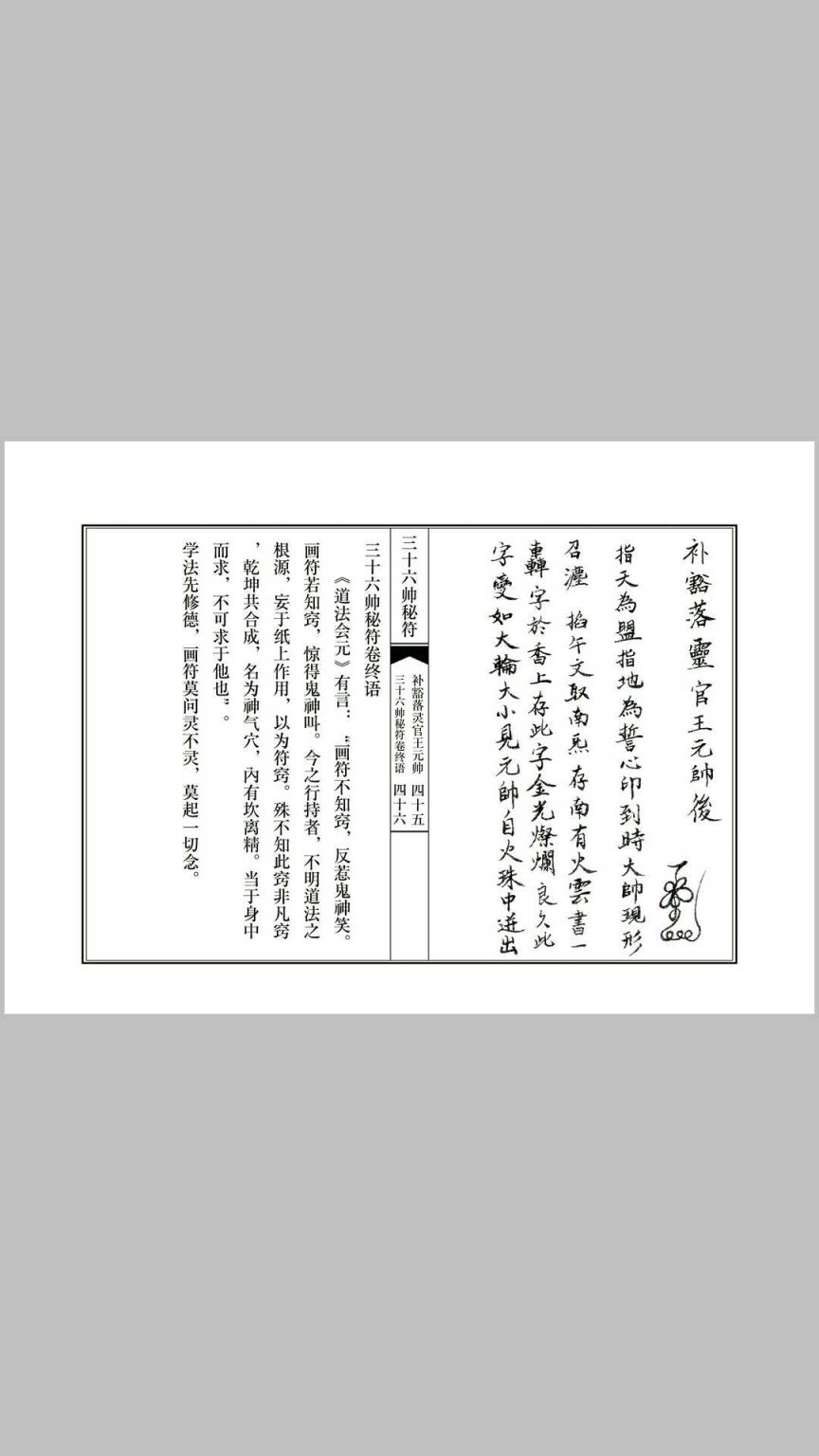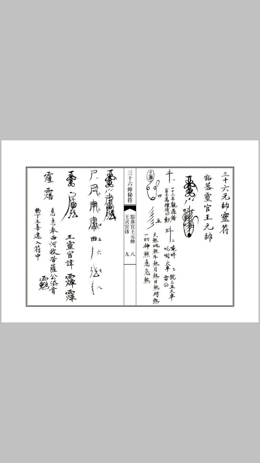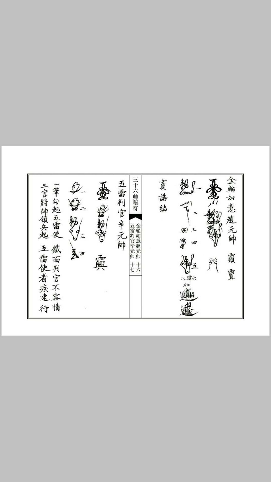 内容:正一天师莲花符.三十六帅画符程序 天师五雷符头画法,八卦符头画法,天师符秘讳字,三十六帅符秘,天师五雷符符秘结构,天师五路招财符符秘结构,豁落灵官王元帅符几种画法及符秘,玄天上帝符画法及符秘,金轮如意赵元帅符几种画法及符秘,斗口魁神马元帅几种画法及符秘,地司太岁殷元帅符画法及符秘,翊宁昭武温元帅符画法及符秘,神威驱邪邹元帅符画法及符秘,飞捷报应张元帅符画法及符秘,五雷执法毕元帅符画法及符秘,雷霆火部苟元帅符画法及符秘,荡瘟灭魔周元帅符画法及符秘,九天降魔关元帅符画法及符秘,冲霄主雷邓元帅符画法及符秘,五雷判官辛元帅符画法及符秘,金阙监生高元帅符画法及符秘,打邪灭巫朱元帅符画法及符秘,雷府驱魔庞元帅符画法及符秘,斗府枢灵刘元帅符画法及符秘,地祇太保康元帅符画法及符秘,丰都拷鬼孟元帅符画法及符秘,丰都杀鬼吕元帅符画法及符秘,东岳拷鬼孟元帅符画法及符秘,沧海湧潮伍元帅符画法及符秘,天篷提督尹元帅符画法及符秘,南极乌旸吴元帅符画法及符秘,上清駆雷程元帅符画法及符秘,正一箓官陈元帅符画法及符秘,五雷天医张元帅符画法及符秘,流金火鈴宋元帅符画法及符秘,三五梅仙张元帅符画法及符秘,神雷之首石元帅符画法及符秘,精忠义勇岳元帅符画法及符秘,水府斩怪杨元帅符画法及符秘,六丁六甲金元帅符画法及符秘,北极冰池李元帅符画法及符秘