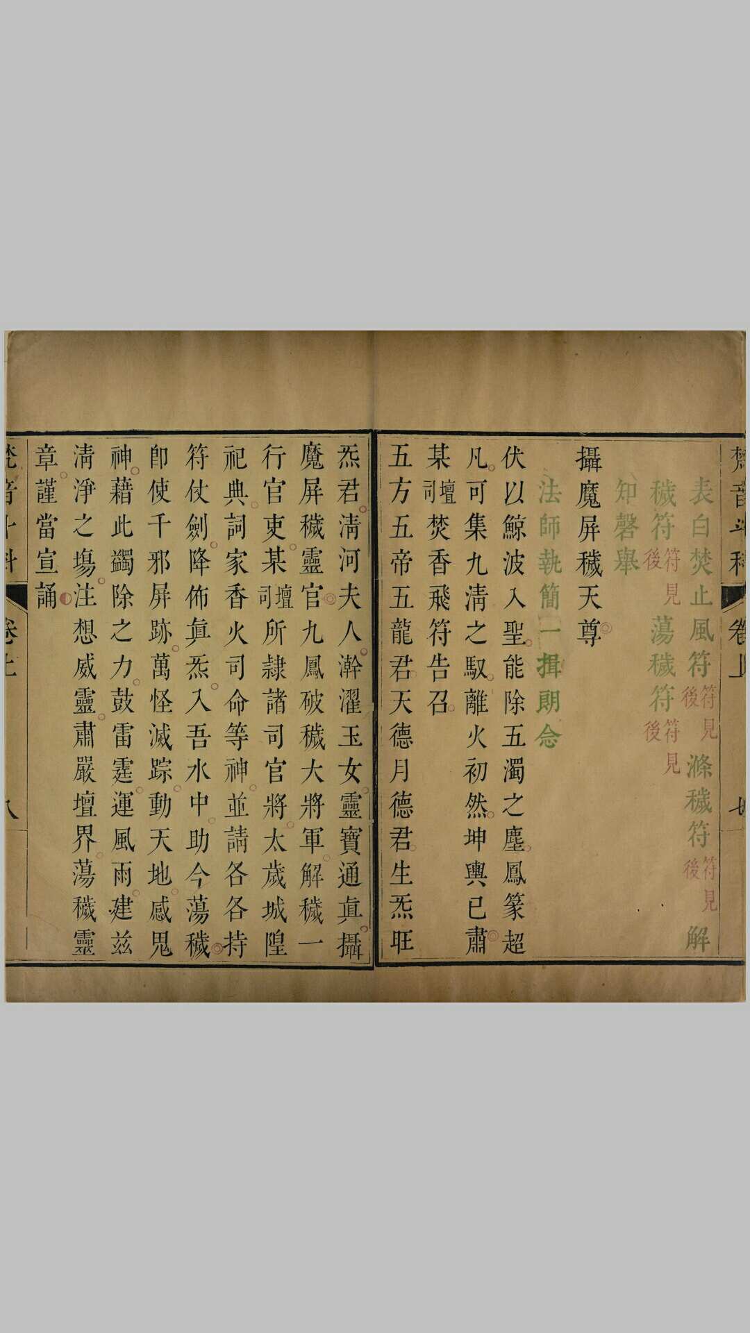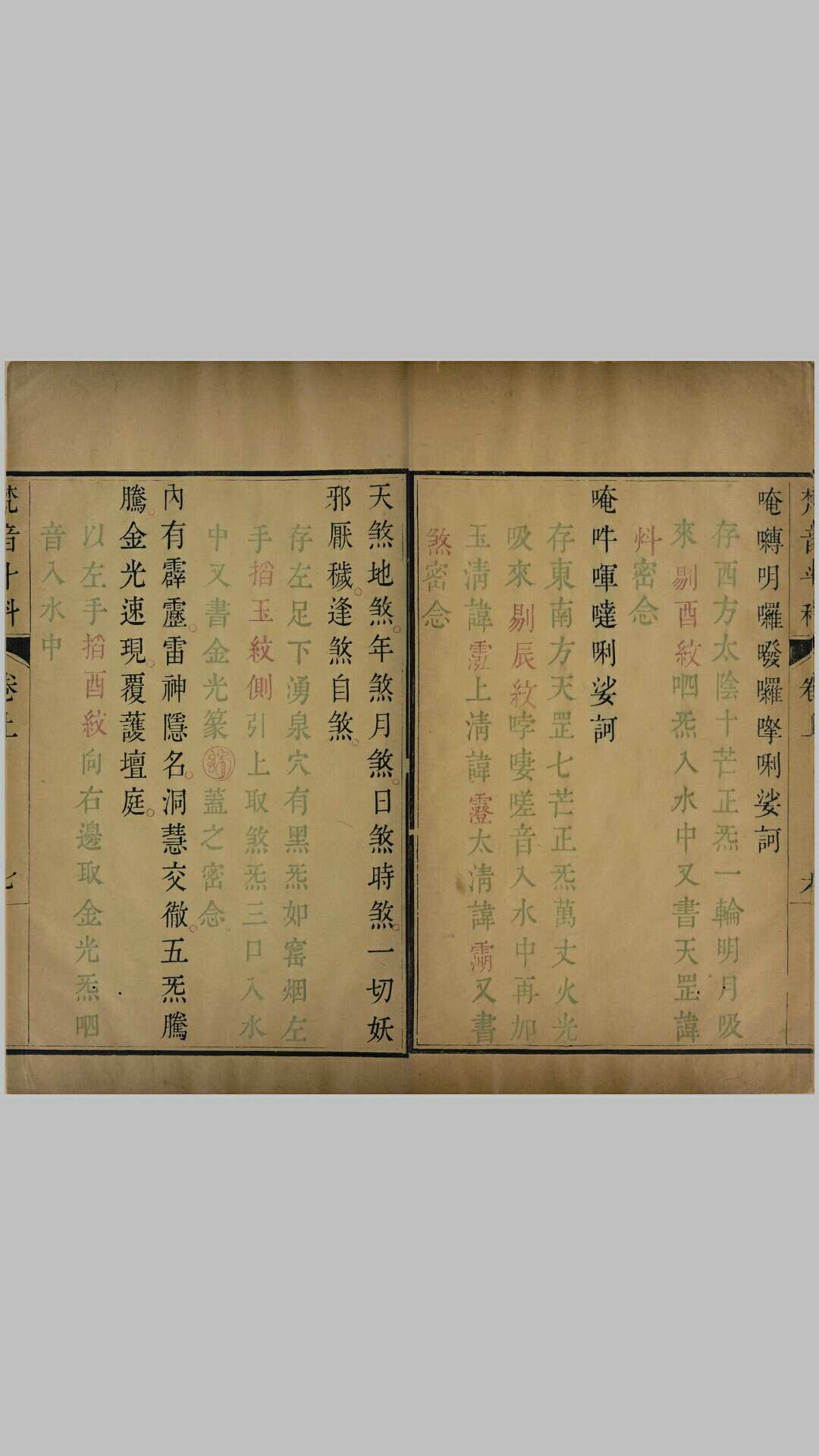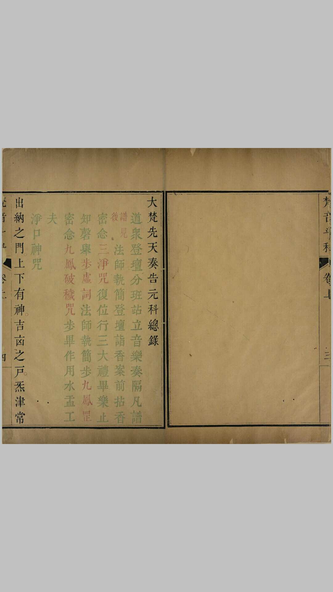 《梵音斗科》(大梵先天奏告科仪)由清代娄近垣撰。全书共分上下卷,主要内容是道教为生者禳病解厄的仪式,包含:大梵先天奏告元科、大梵先天奏告符秘、大梵先天奏告文检、先天奏告符盆二十八宿占验、先天奏告乐谱等内容。此为清雍正时期四色(硃墨黄绿)套印刊本。