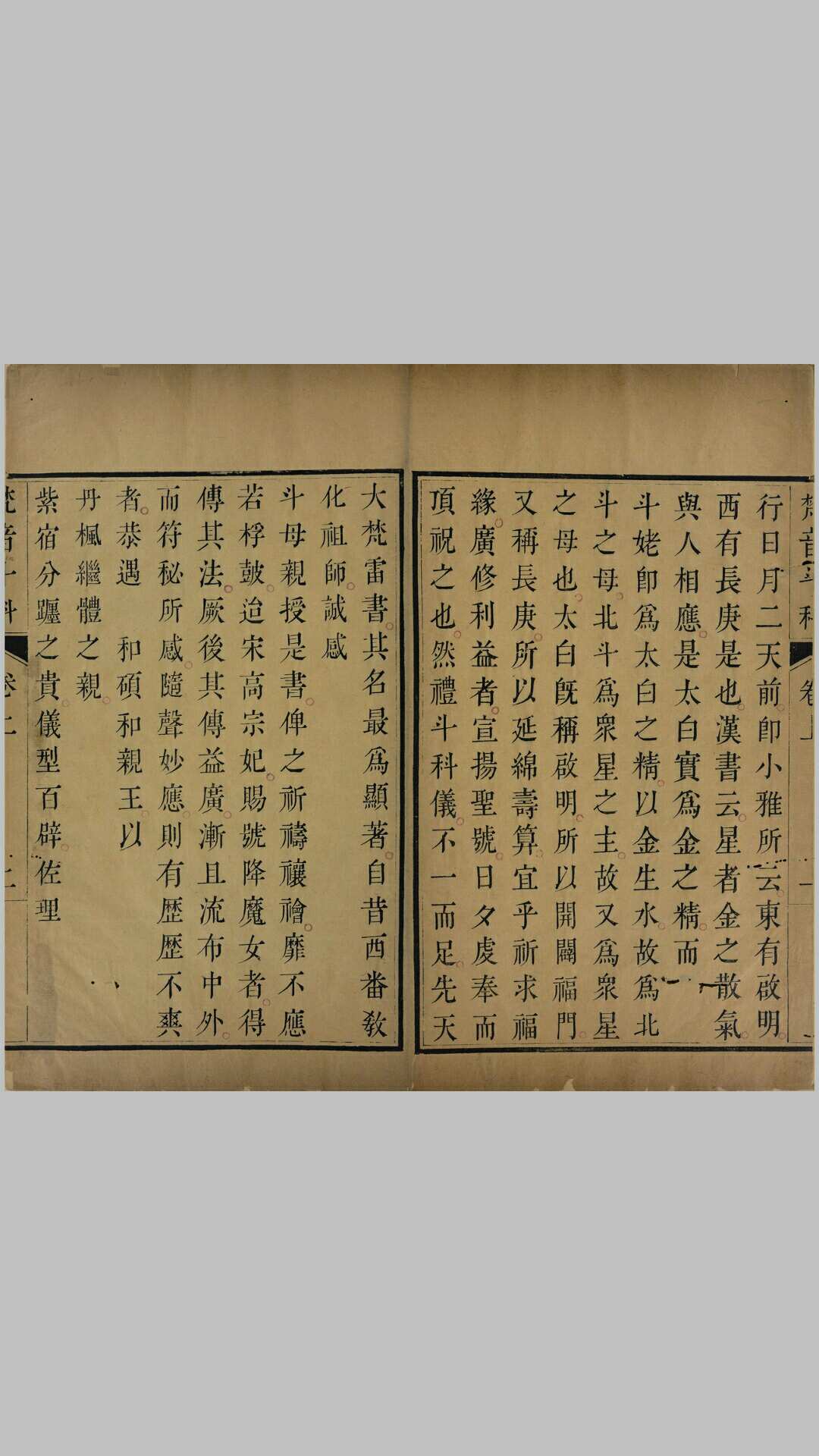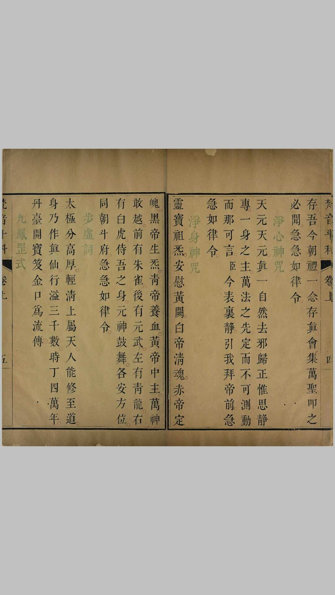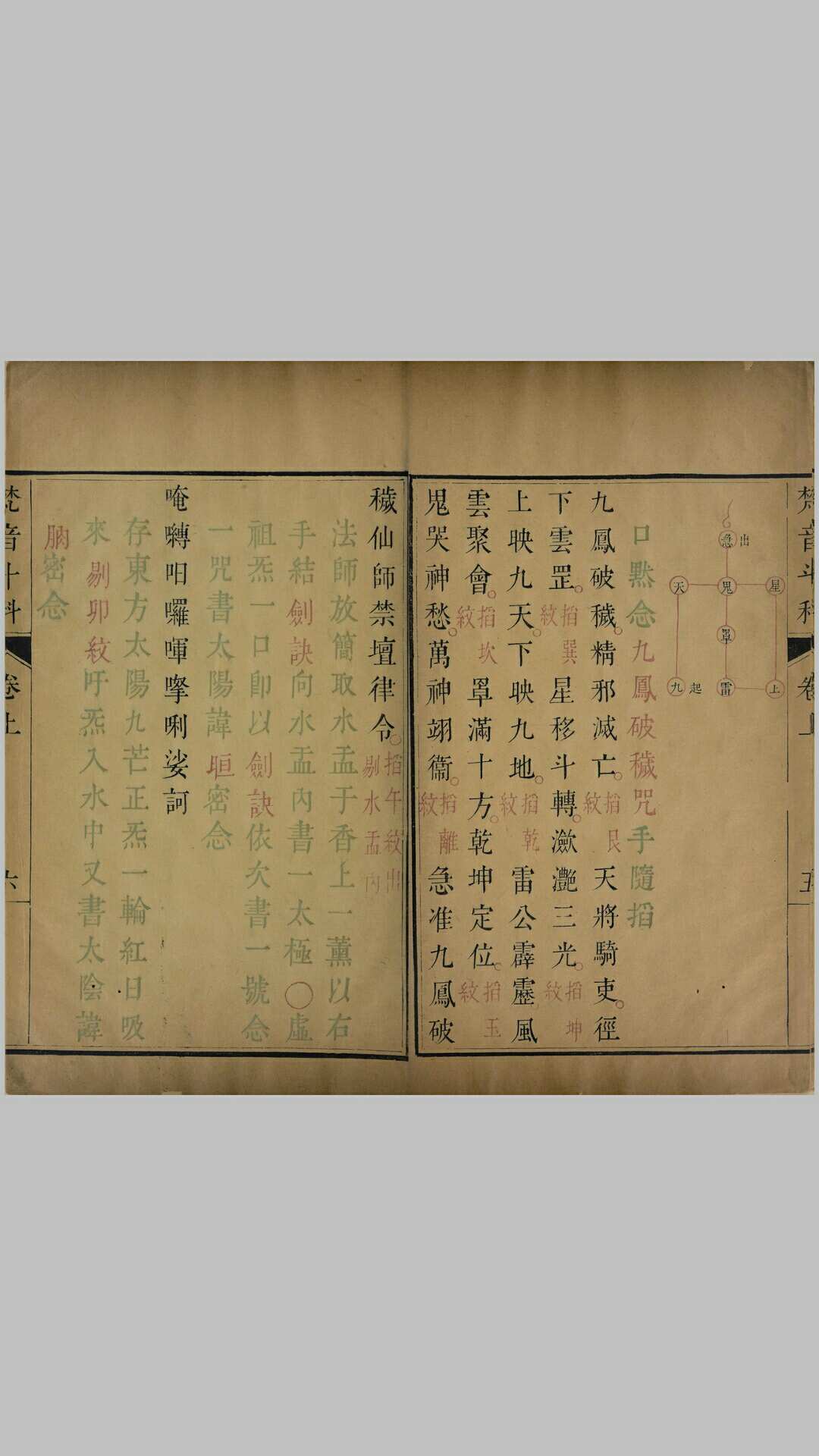 《梵音斗科》(大梵先天奏告科仪)由清代娄近垣撰。全书共分上下卷,主要内容是道教为生者禳病解厄的仪式,包含:大梵先天奏告元科、大梵先天奏告符秘、大梵先天奏告文检、先天奏告符盆二十八宿占验、先天奏告乐谱等内容。此为清雍正时期四色(硃墨黄绿)套印刊本。