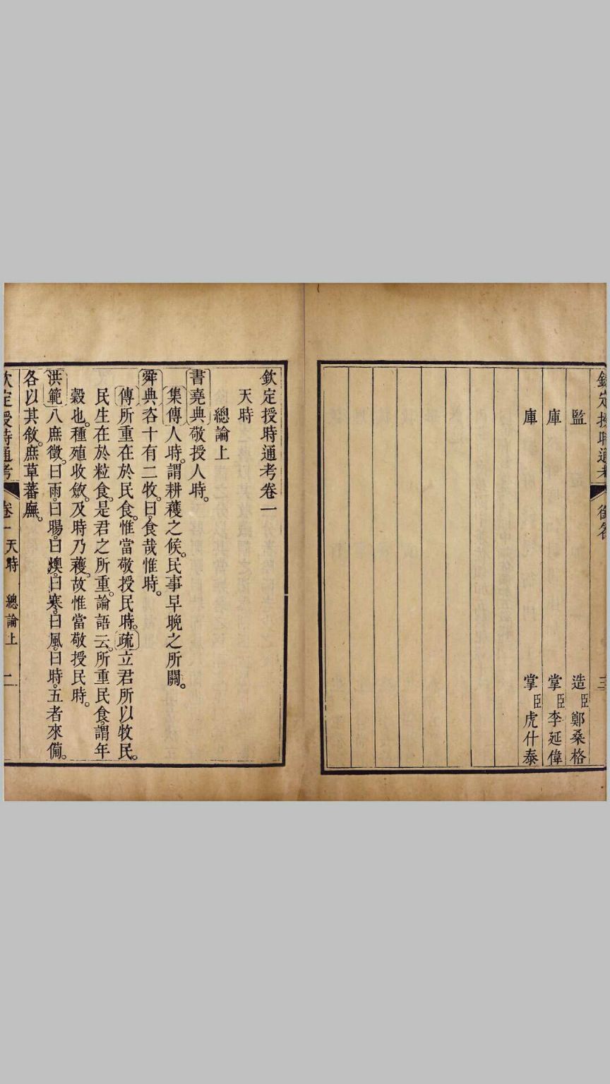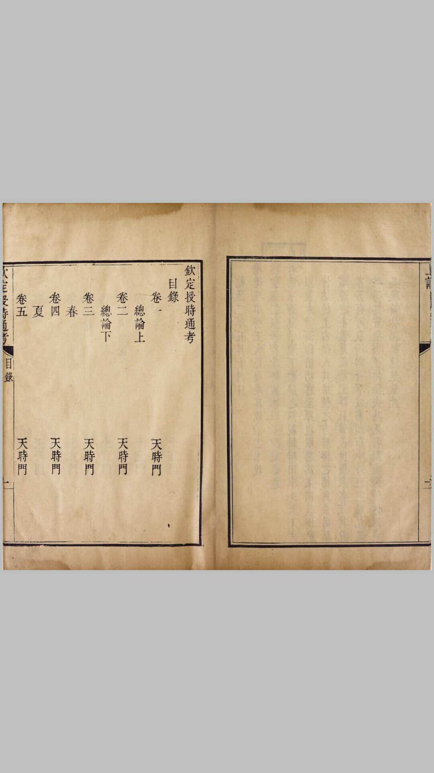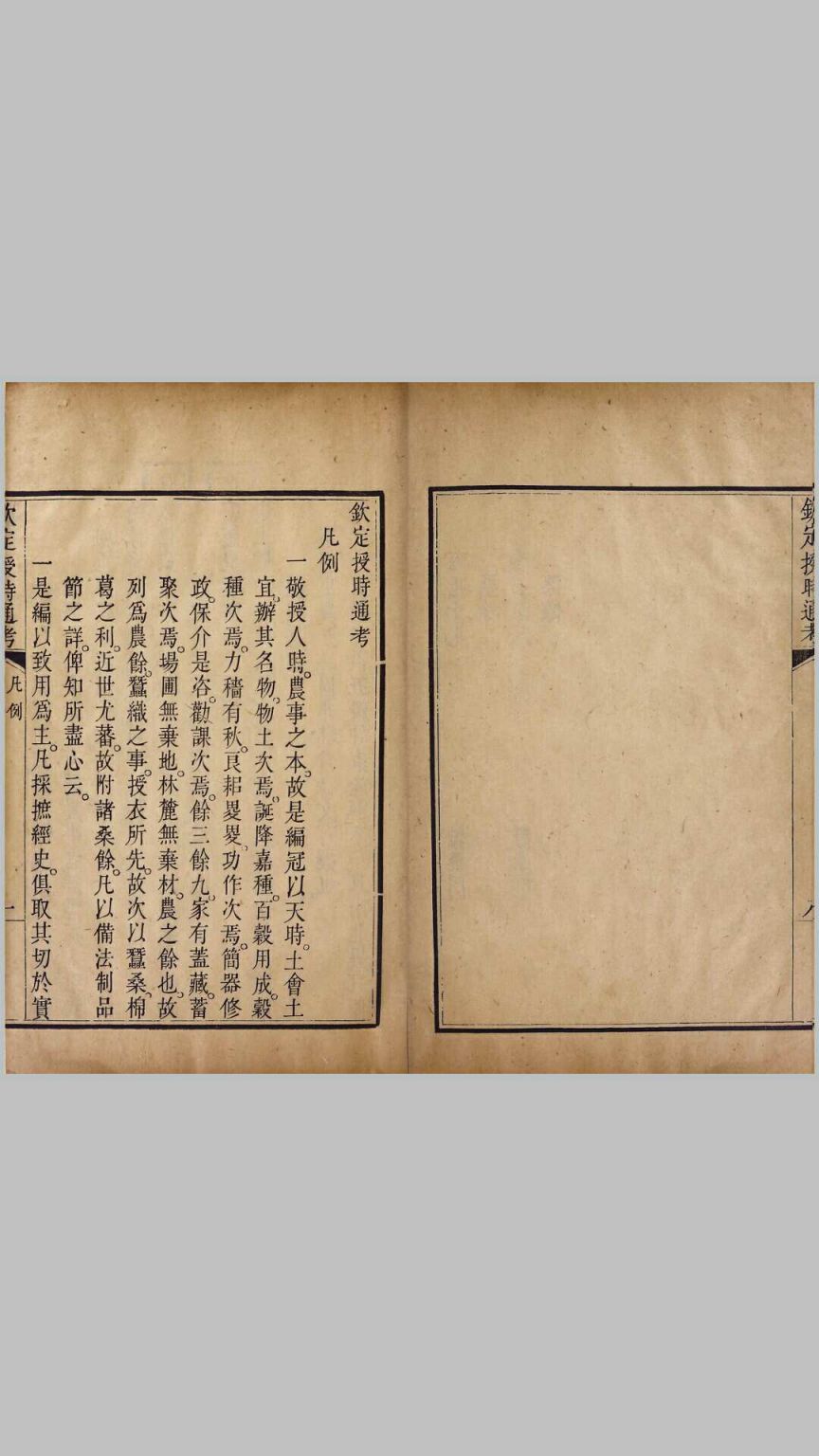 《钦定授时通考》为清朝官修的综合农书典籍,由弘昼、鄂尔泰、张廷玉等奉敕纂修。全书共七十八卷,分为:天时、土宜、谷种、功作、劝课、蓄聚、农馀、蚕桑,共八门。其内容采纳各朝经、史、子、集书籍中有关农事的文献记载五百多种,选录资料三千五百多条,配绘插图五百余幅。此为清乾隆七年武英殿刊本。