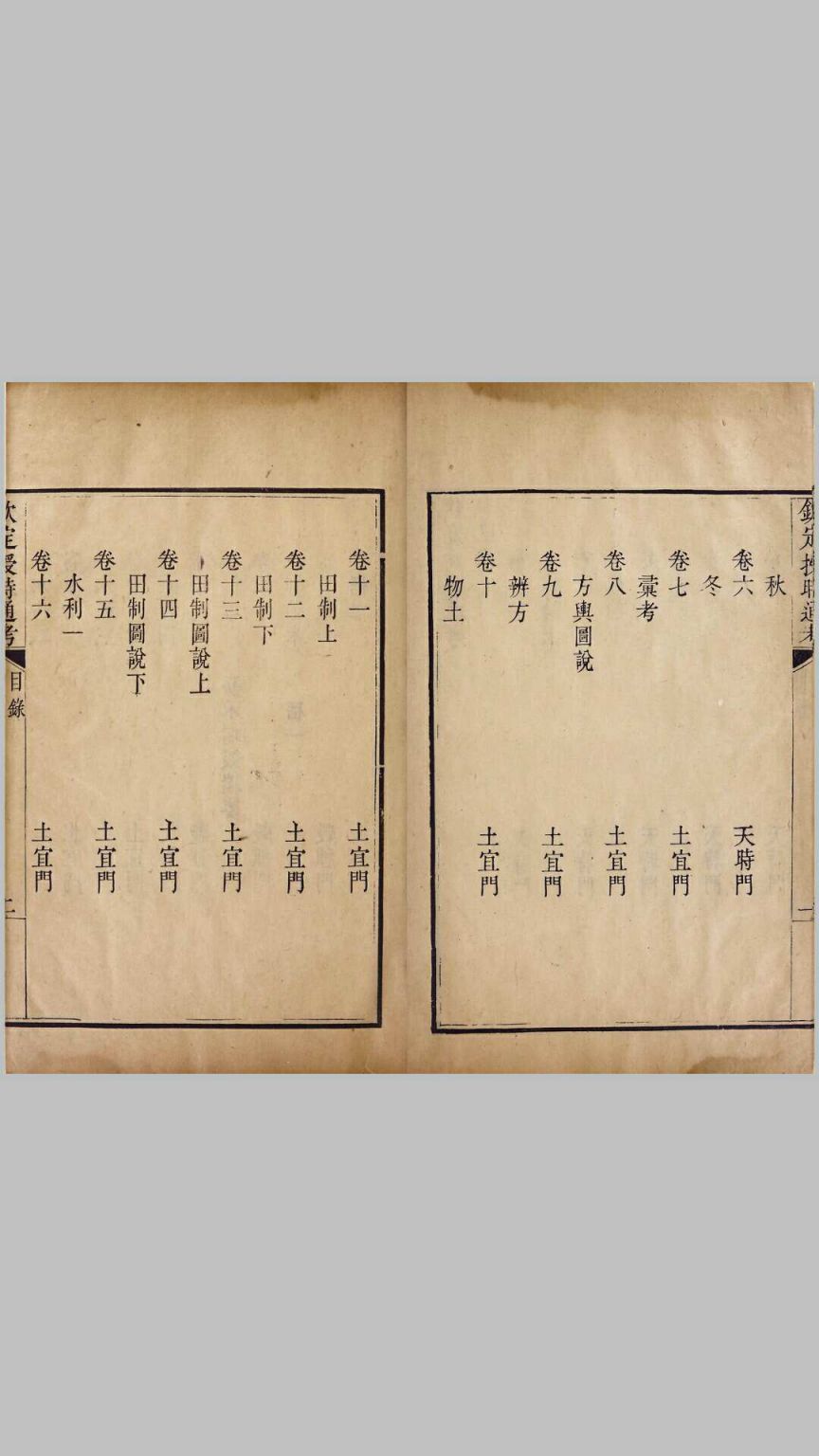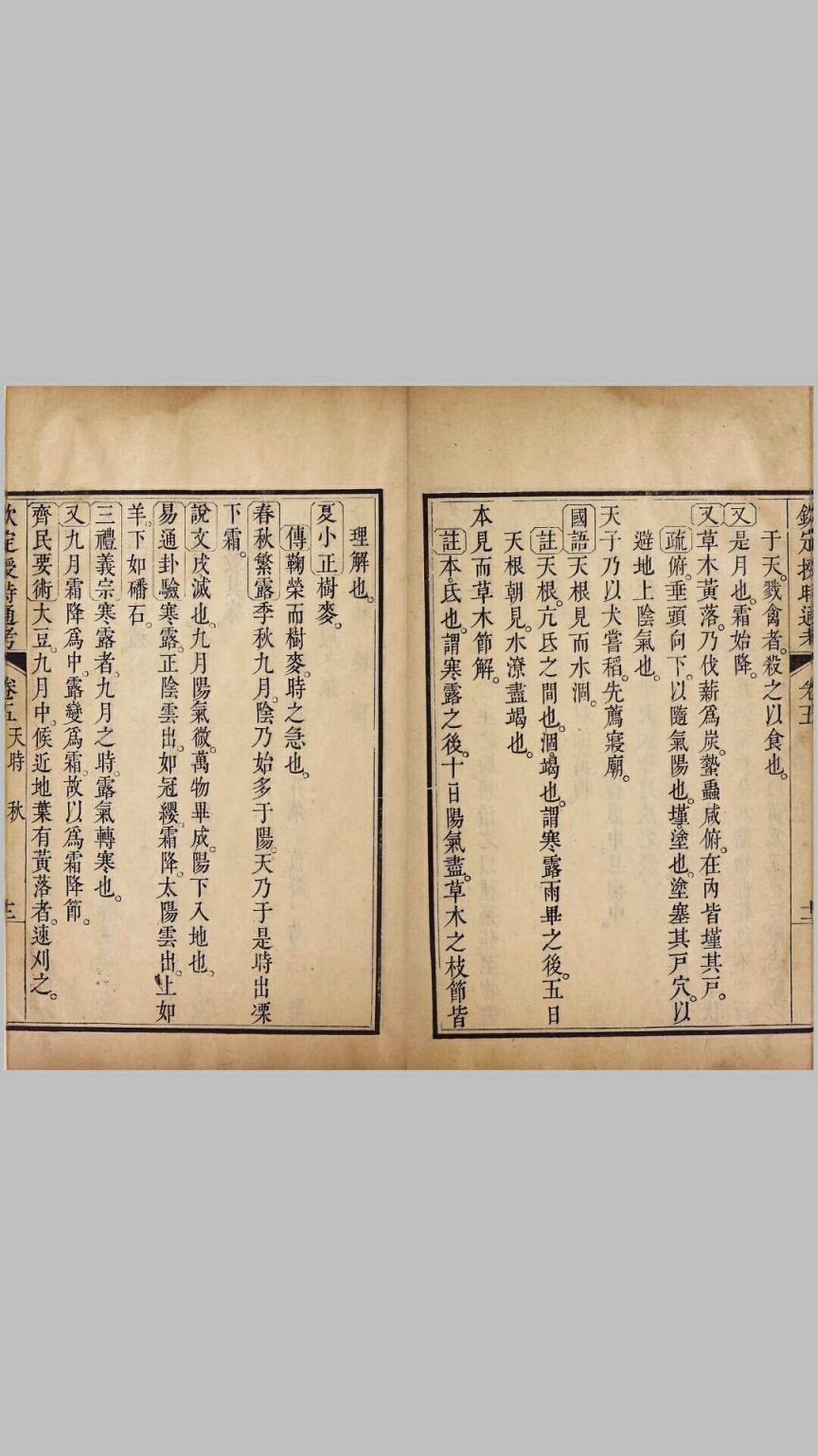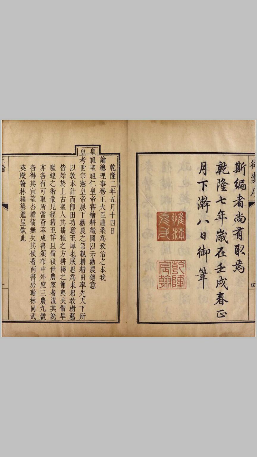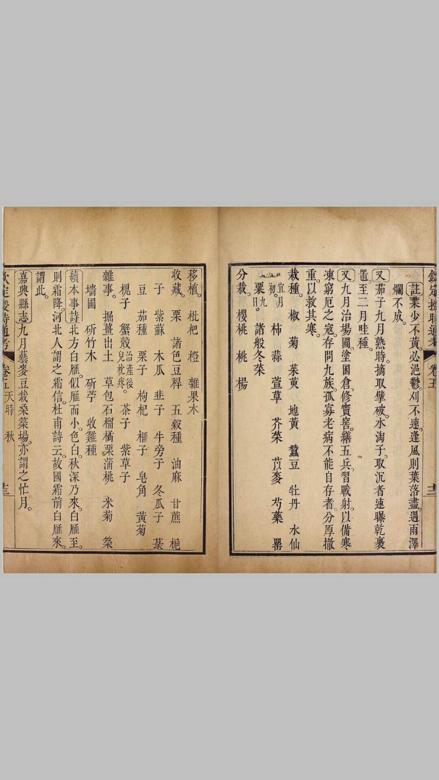 《钦定授时通考》为清朝官修的综合农书典籍,由弘昼、鄂尔泰、张廷玉等奉敕纂修。全书共七十八卷,分为:天时、土宜、谷种、功作、劝课、蓄聚、农馀、蚕桑,共八门。其内容采纳各朝经、史、子、集书籍中有关农事的文献记载五百多种,选录资料三千五百多条,配绘插图五百余幅。此为清乾隆七年武英殿刊本。