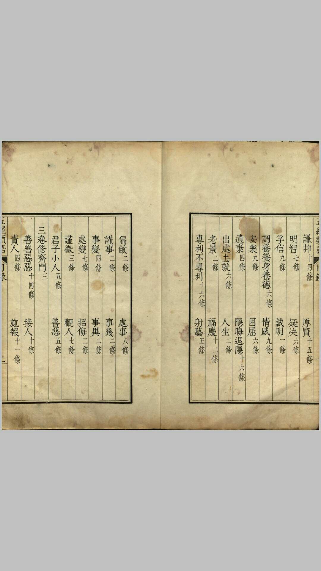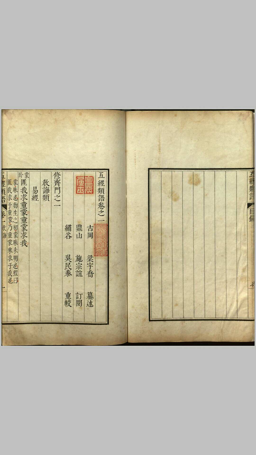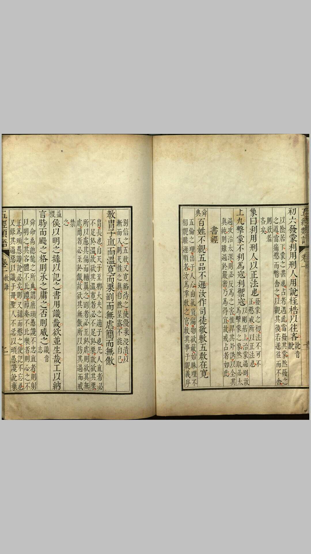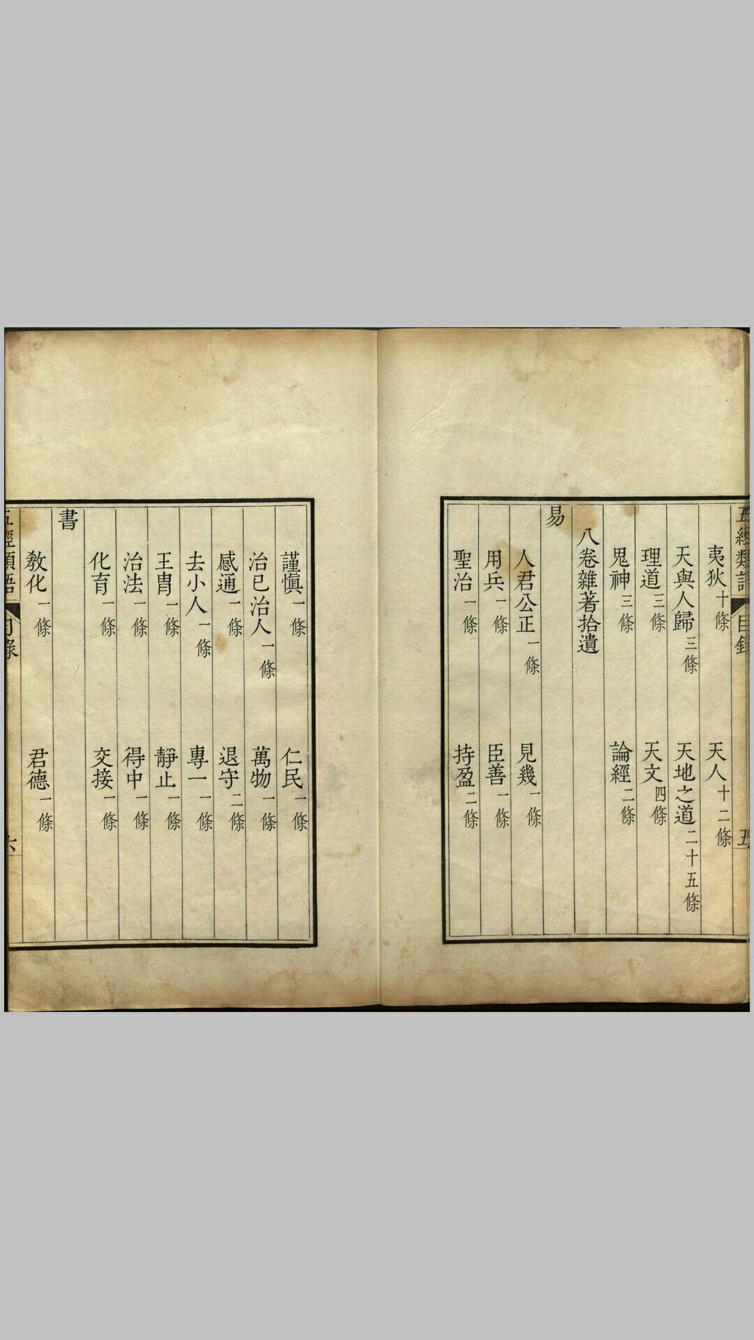 《五经类语》由明代梁宇乔编撰。全书共八卷,前七卷分修齐、治平两门,修齐门有六十二子目,治平门八十七子目。修齐治平出自《大学》,即:修身、齐家、治国、平天下。卷八为杂著拾遗。其内容为摘取五经之语,并加以阐述。此本应为清康熙时期果亲王府精钞本。