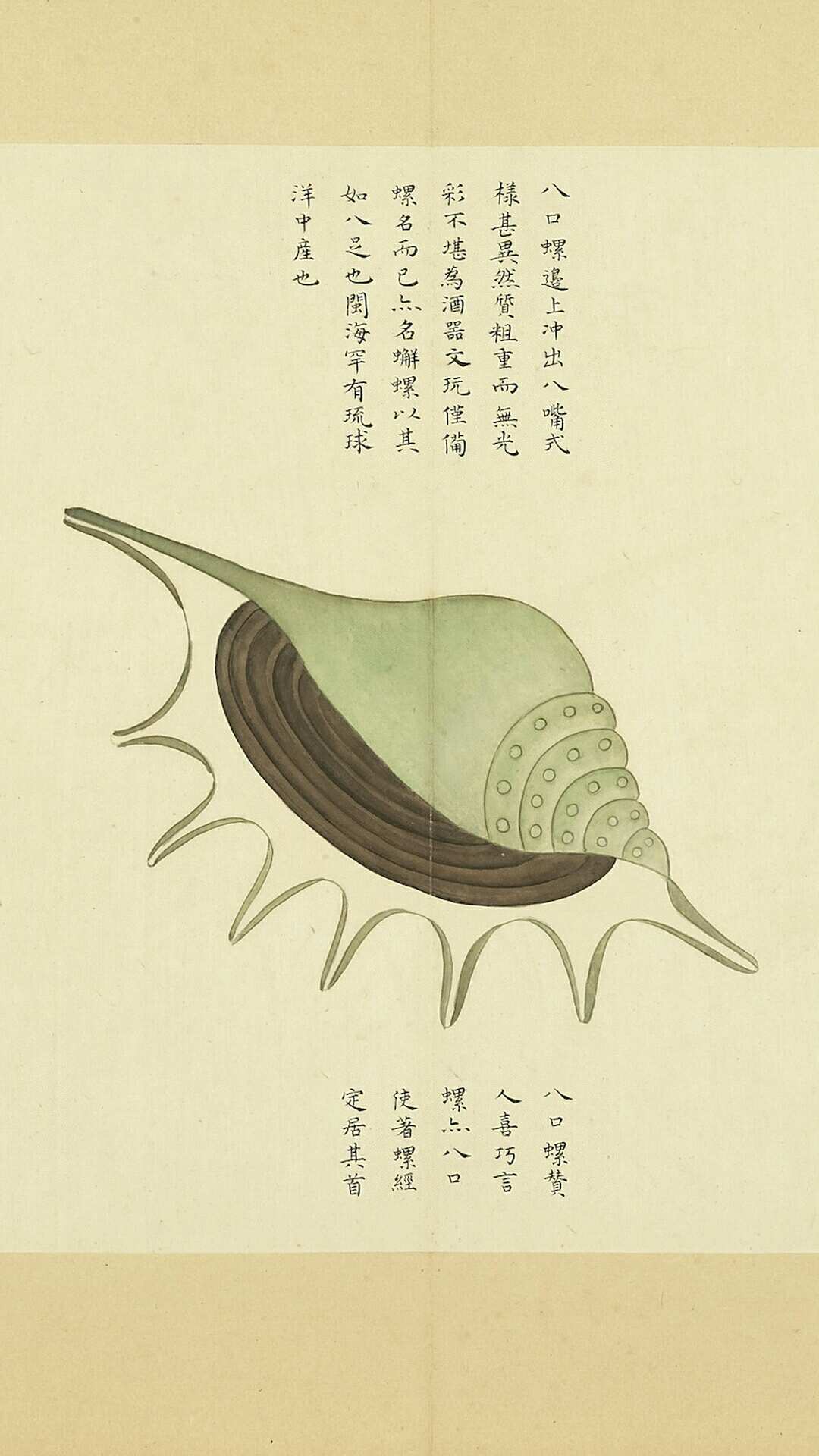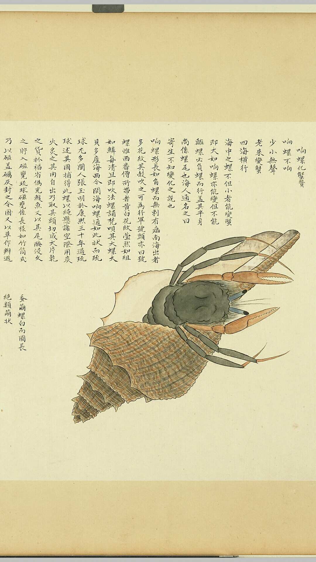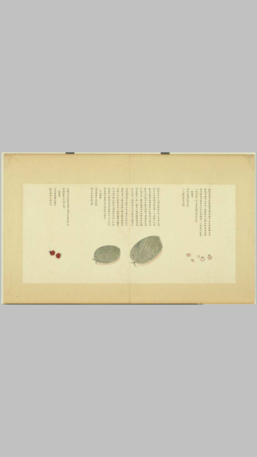 《海错图》由清代画家兼生物爱好者聂璜绘制。书中共描述了三百多种生物,还记载了不少海滨植物,是一本颇具现代博物学风格的奇书。全套共四册(前三册藏于北京故宫博物院),此为台北故宫博物院藏第四册,共四十四开,主要画鲎、螺、蟹、虾等海中生物,每幅楷书题名并赞。