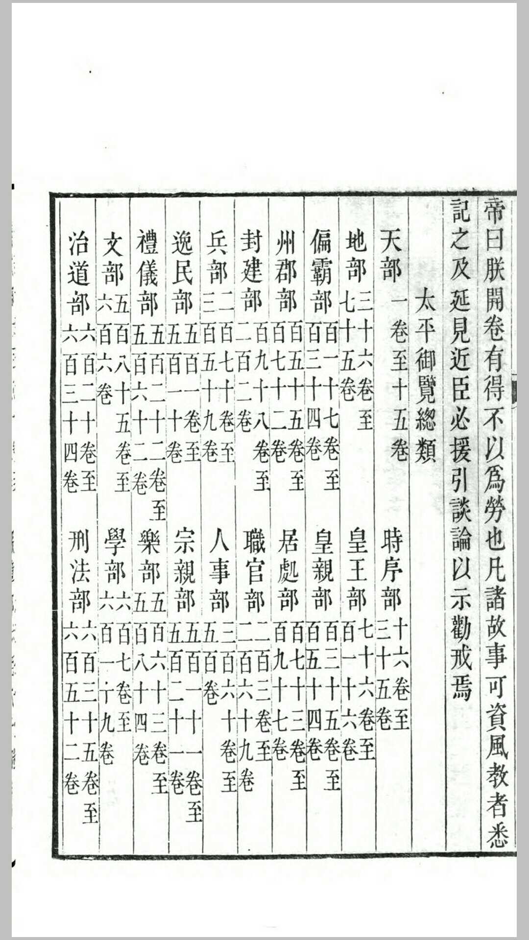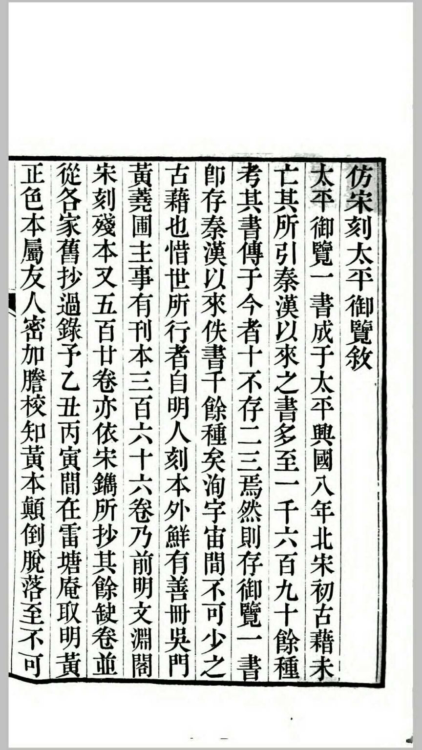 《太平御览》是宋代著名的类书,为北宋李昉、李穆、徐铉等学者奉敕编纂,始于太平兴国二年(977)三月,成书于太平兴国八年(983)十月。 《太平御览》采以群书类集之,凡分五十五部五百五十门而编为千卷,所以初名为《太平总类》;书成之后,宋太宗日览三卷,一岁而读周,所以又更名为《太平御览》。 全书以天、地、人、事、物为序,分成五十五部,可谓包罗古今万象。书中共引用古书一千多种,保存了大量宋以前的文献资料,但其中十之七八已经亡佚,更使本书显得弥足珍贵,是中国传统文化的宝贵遗产。