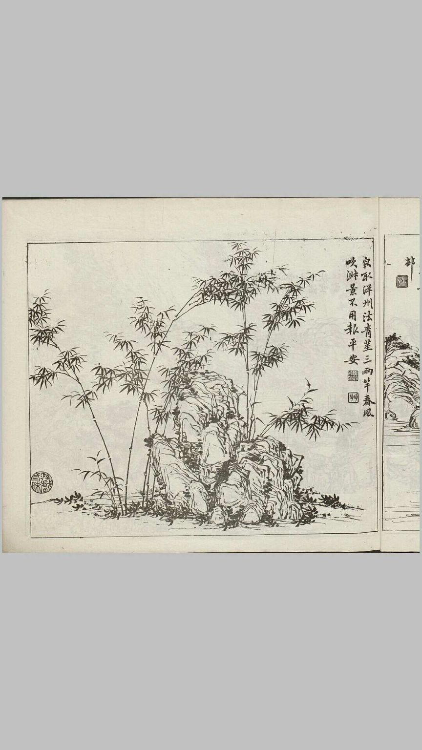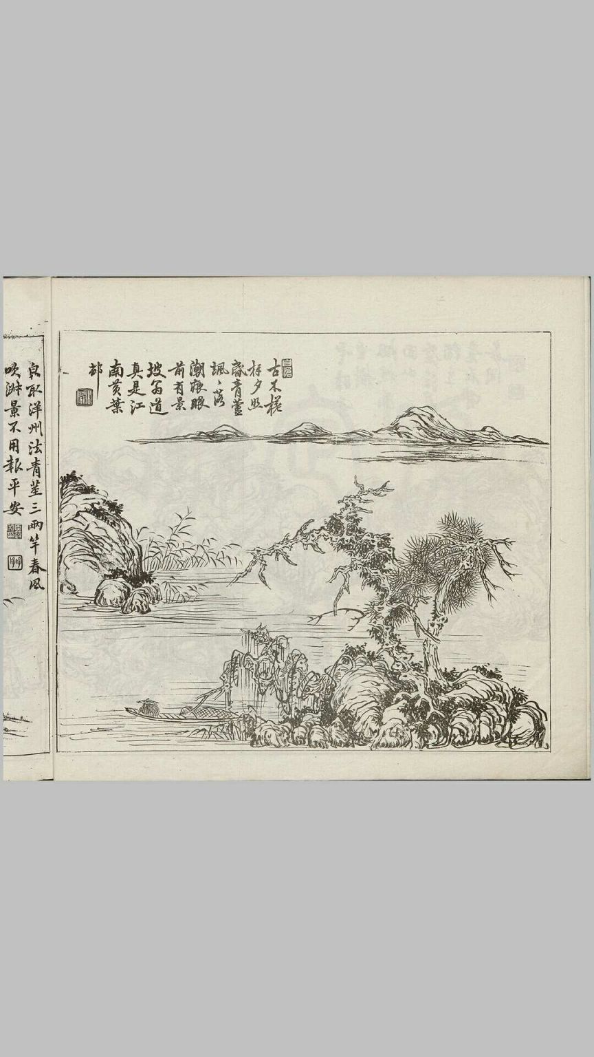 画册《沧江虹月》(又名:茜窗小品)其内摹刻名家画作十四种:赵松雪画九歌、邵僧弥山水、大涤子山水、南田萃华卉、林屋山人山水画谱、翁小海草虫、改绮画稿、瑶华道人真迹、董文恪公山水画稿、东霞写生、子衡花卉、任熊画本、秦谊庭山水松鹤画典、刘子和花卉翎毛册。此为清末民初上海同文书局石印本,共两册。