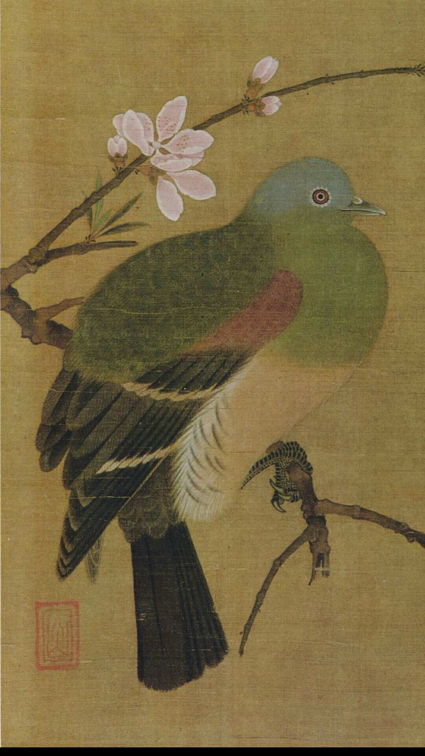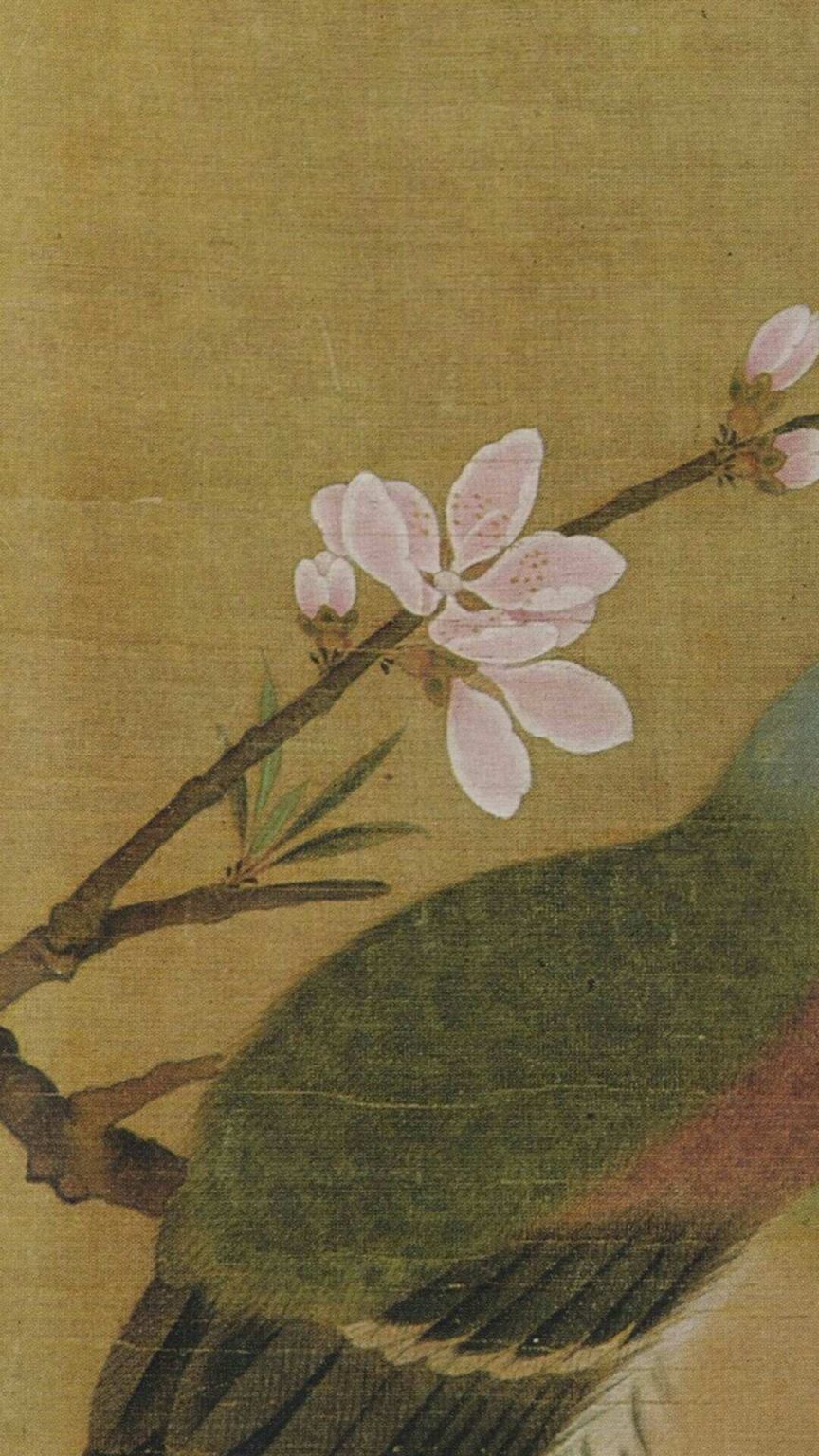 《桃鸠图》是北宋赵佶创作的一幅绢本设色画,现属于日本个人收藏。 整幅画桃花与枝叶钩勒精工,栖鸠动态自然而生动,用生漆点睛,卓有神采,整体色彩华丽,瘦金书稍稚嫩。
