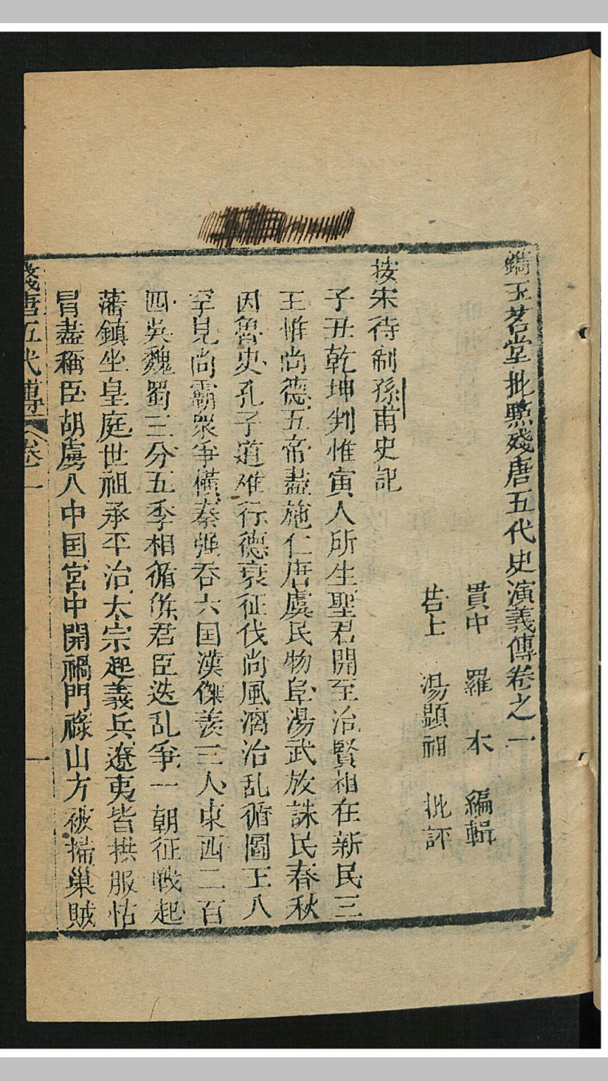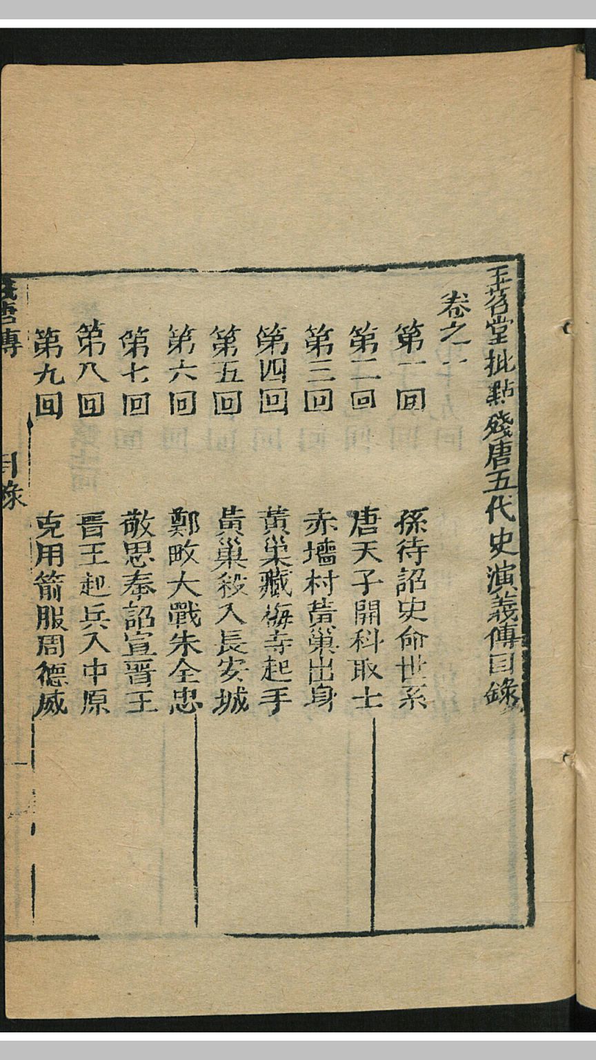 《残唐五代史演义》又名《五代残唐》,为《隋唐志传》续书,明朝李卓吾批点本,八卷六十回。题“罗贯中编辑”,但似为明代后期无名氏作品,罗贯中原版仅存一些孤本。以编年体例,描述自黄巢起义至陈桥兵变止,这段时期的动荡兴衰历史。主要写唐末和五代时期重大的政治、军事斗争。据新、旧《唐书》、《五代史》和民间传说中的有关故 事写成。小说在创作上仿效《三国演义》,成就却逊色得多。个别章节写的比较生动。如李存孝和铁枪王彦章的故事,都写得虎虎有生气。但全书平直粗陋,没有什么特色。《残唐五代史演义》在民间流传较广,对后世小说、戏剧创作有一定影响。