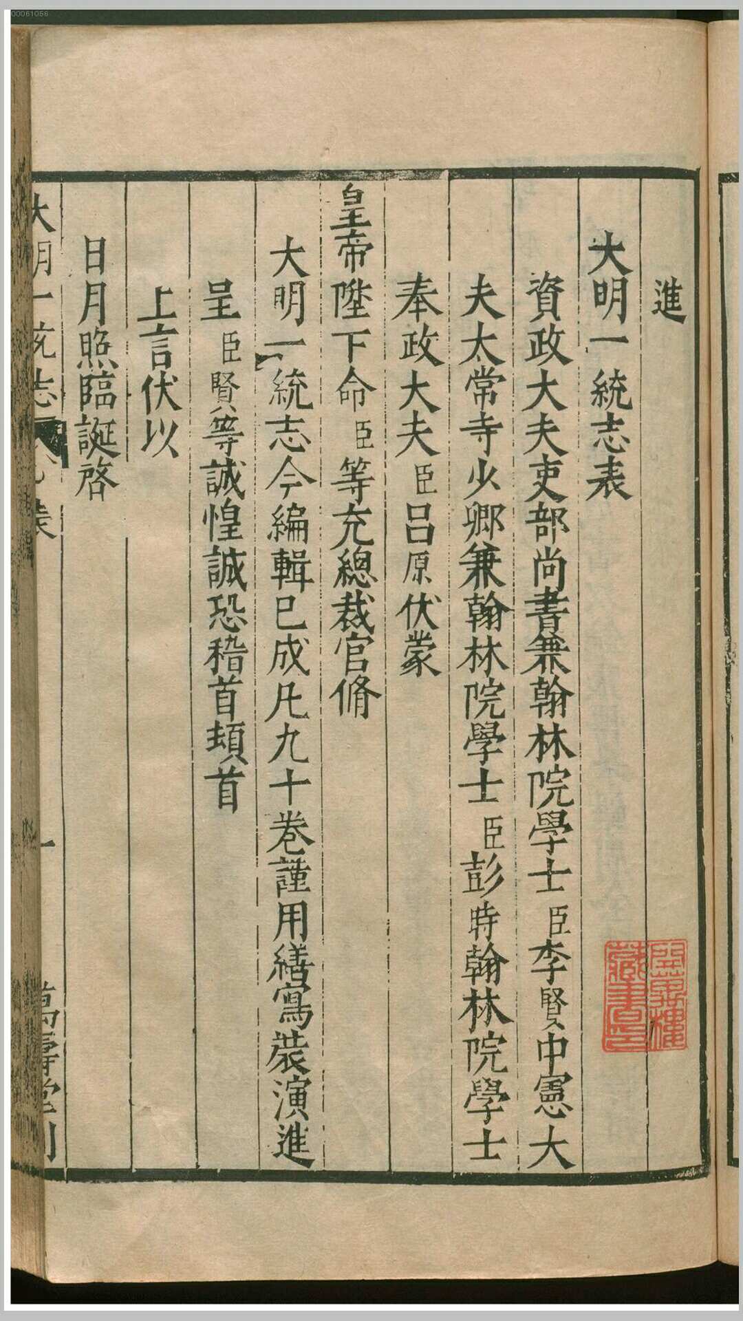 《大明一统志》是明代官修地理总志,由李贤、彭时等纂修,成书于天顺五年(1461年)四月,共90卷,体例源自《大元大一统志》。