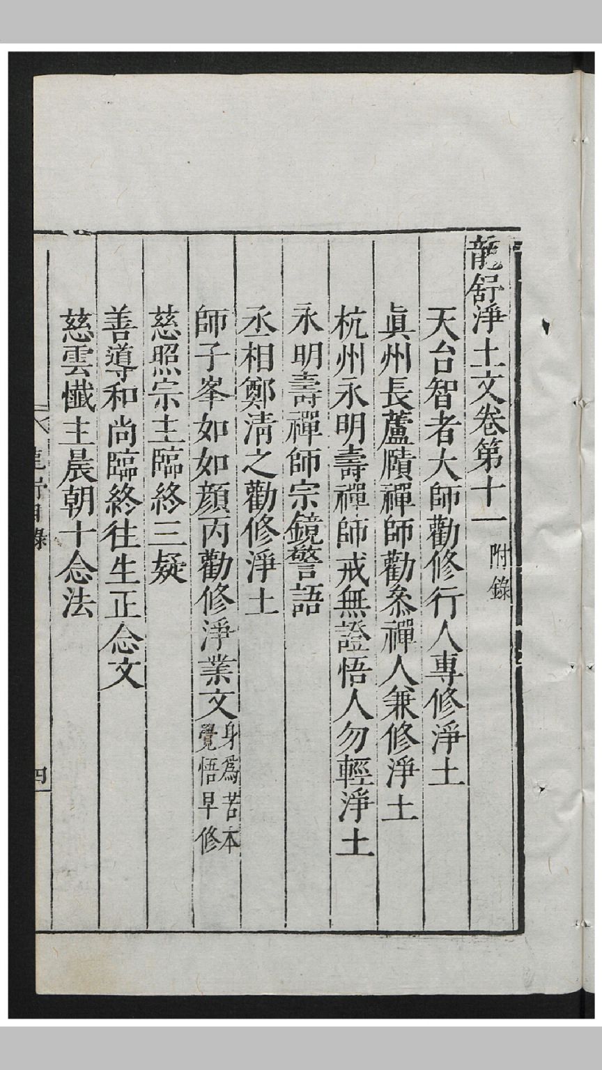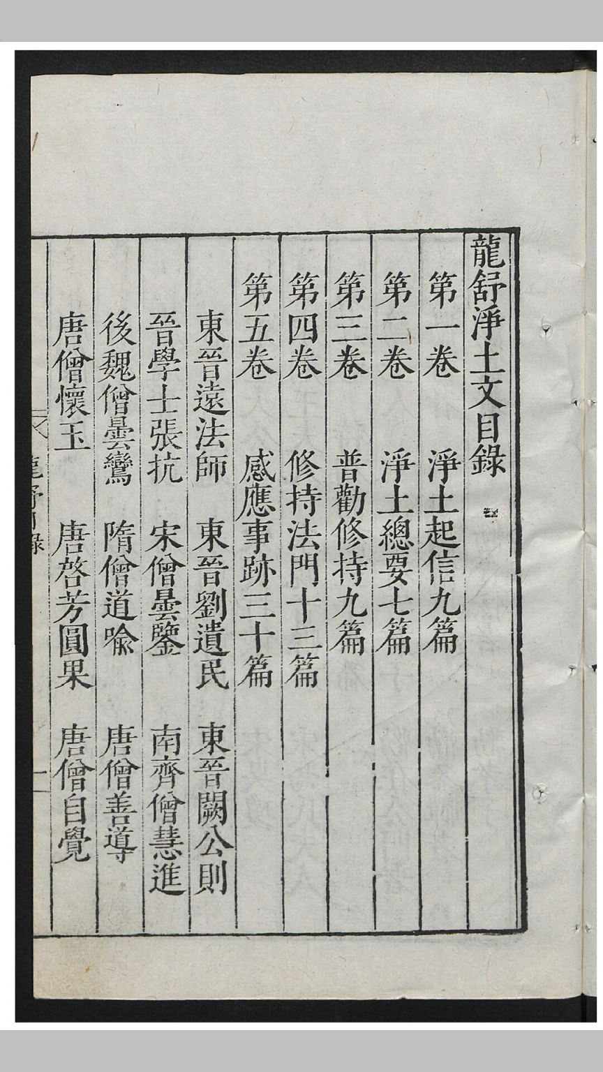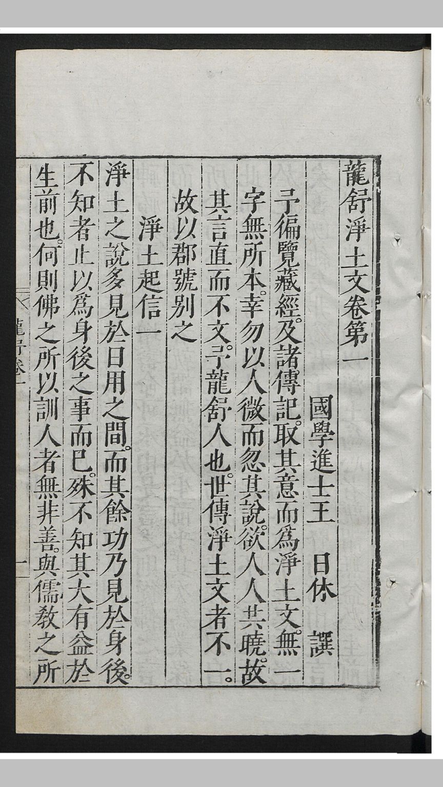 王日休居士(?~1173),字虚中,龙舒(今安徽省舒城)人,故以龙舒名其文。是书集录有关往生西方净土之经论、传记等,原著10卷,即《净土起信》、《净土总要》、《普劝修持》、《修持法门》、《感应事迹》、《特为劝喻》、《指迷归要》、《现世感应》、《助修上品》、《净浊一如》等10章(一章为一卷),後人增广为十一卷或十三卷,嘉禾僧卺〔jǐn ㄐ〡ㄣˇ〕改为十二卷,即今现行之《龙舒增广净土文》。