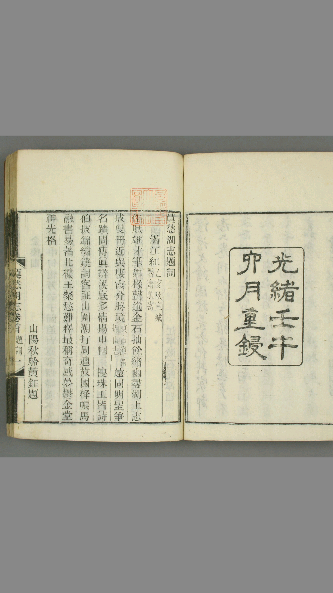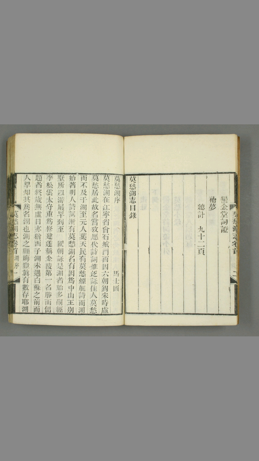 莫愁湖,位于南京秦淮河西。《莫愁湖志》是清朝光绪年间马士图编辑的一本手抄版藏书,分上、下两册。上册一至四卷,印有“光绪壬午卯月重锓”;下册五六两卷,印有“光绪辛卯五月重锓”。其中版画有明中山王遗像、莫愁湖图两幅、曾公像、卢莫愁小像。