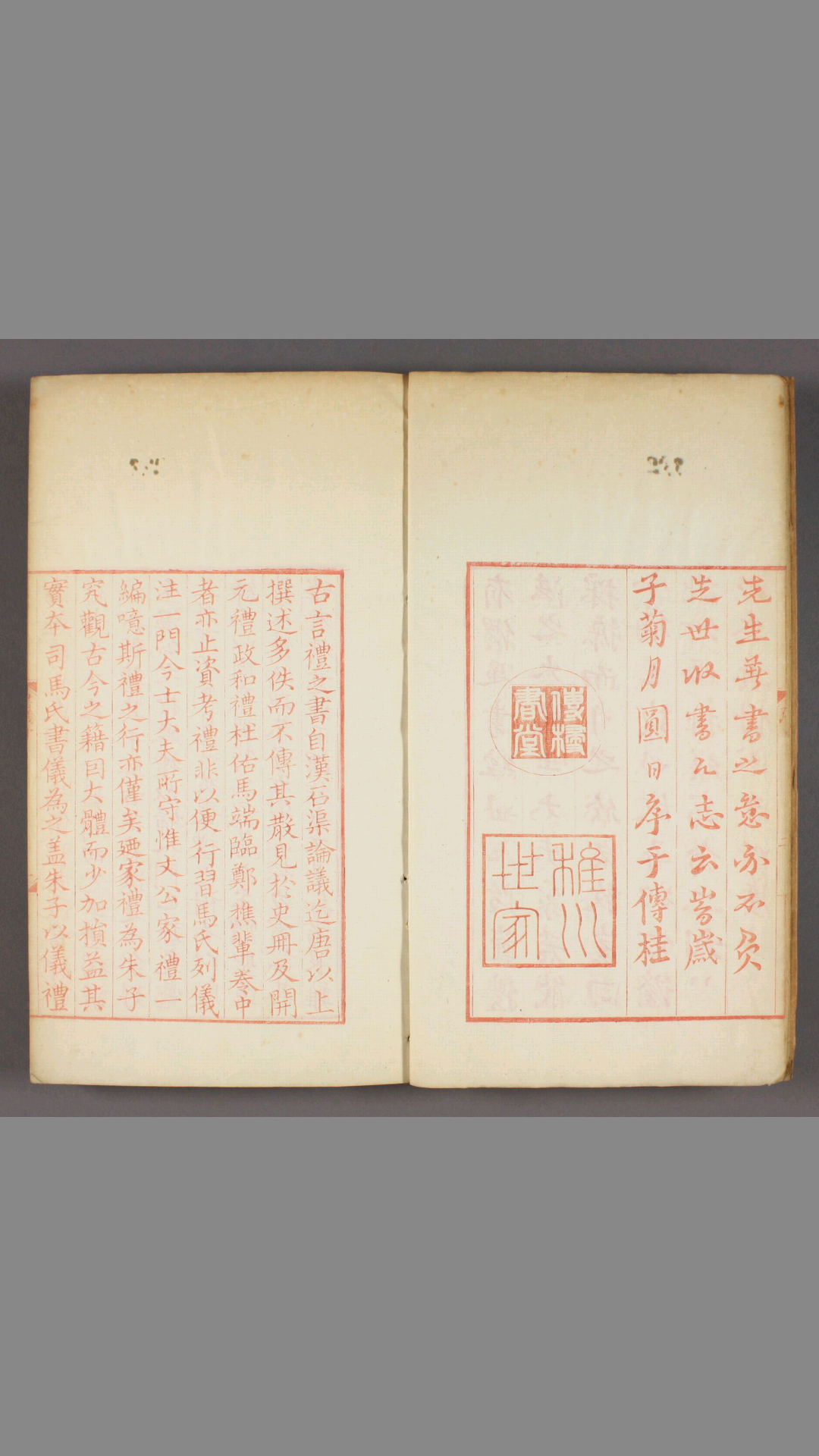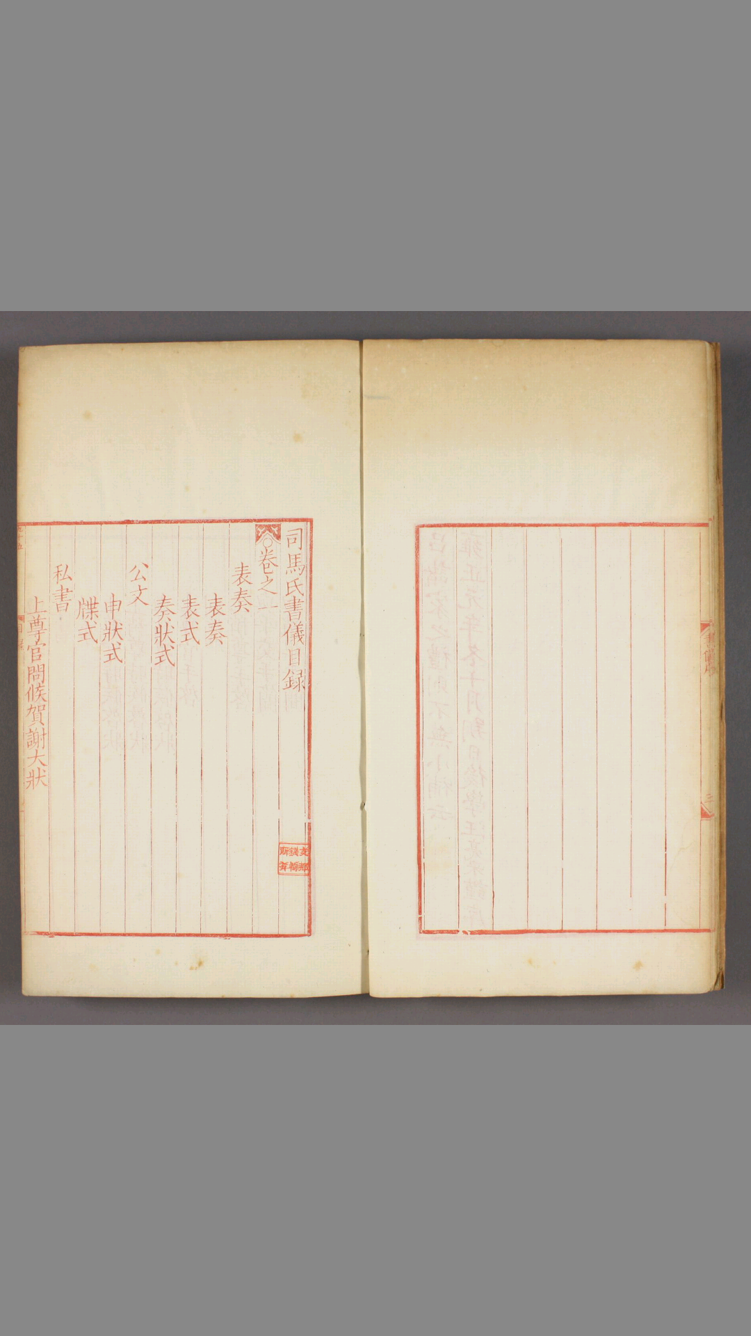 旧时士大夫私家关于书札体式﹑典礼仪注的著作,通名书仪。此本《司马氏书仪》便是北宋著名文人司马光的关于家庭礼仪的著作。此本为同治7年(1868年)江苏书局的朱红色仿宋刊本。